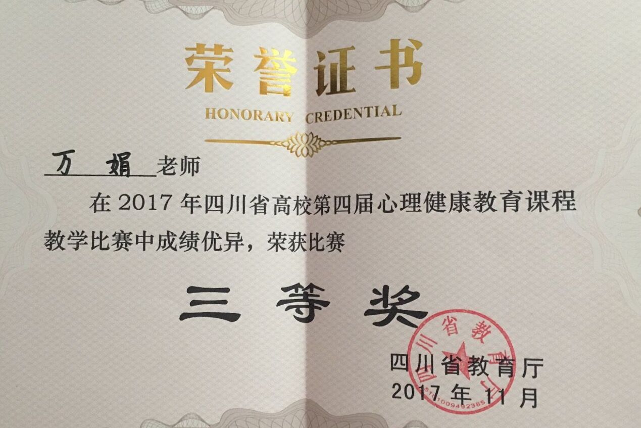 【本网讯】11月17日,第四届四川省高校心理健康教育课程教学比赛在四川旅游学院举行。伟德官网软件工程学院辅导员万娟老师荣获比赛三等奖。