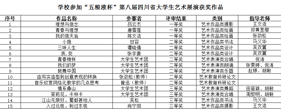 学校参加“五粮液杯”第八届四川省大学生艺术展演获奖作品