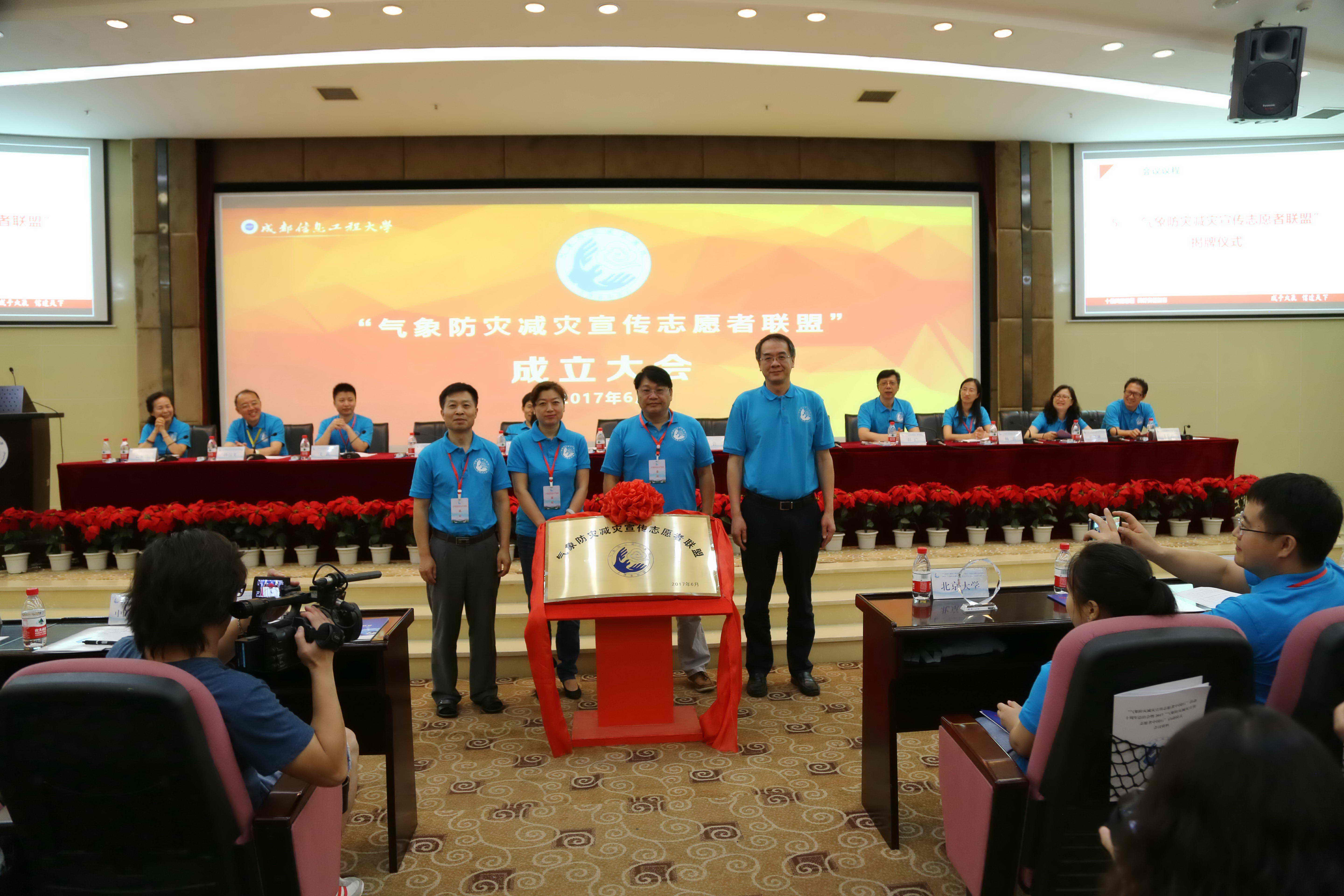 中国气象局办公室副主任洪兰江、中国科协科普部副部长钱岩、联盟理事长翟盘茂、bv伟德国际1946校长余敏明为“气象防灾减灾宣传志愿者联盟”揭牌。