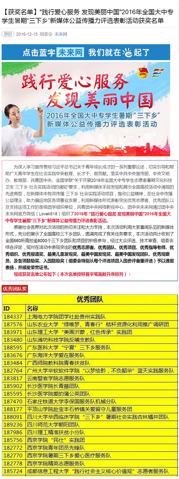 【本网讯】近日,从共青团中央未来网官方微信获悉,在团中央“践行爱心服务 发现美丽中国”2016年全国大中专学生暑期“三下乡”新媒体公益传播力评选表彰活动中,伟德官网“践行社会主义核心价值观”志愿者服务队荣获“全国优秀团队”荣誉称号,成为全国100支优秀团队中的一员,这也是伟德官网社会实践服务队连续第二年获得全国大中专学生“三下乡”社会实践优秀团队荣誉称号。