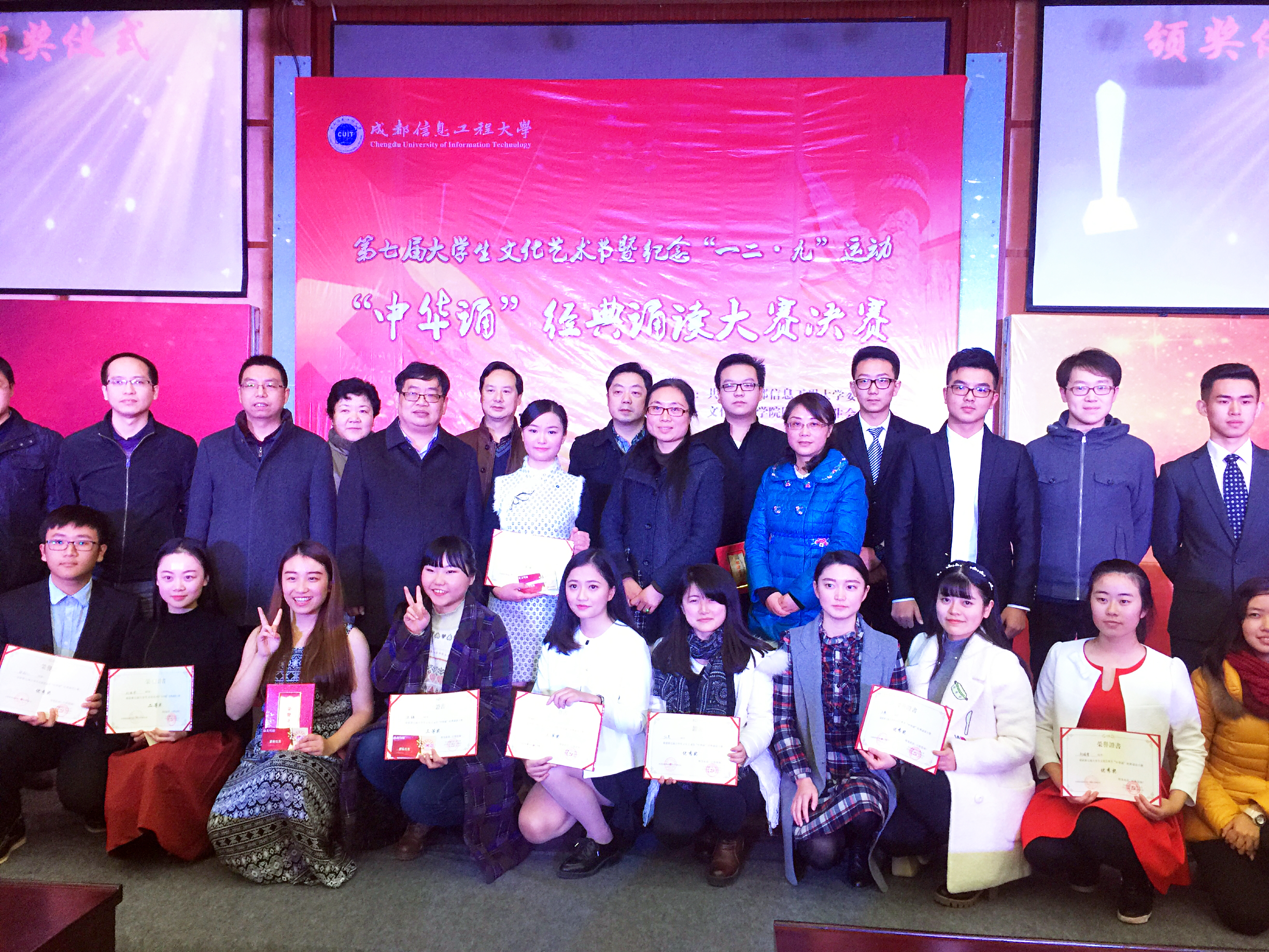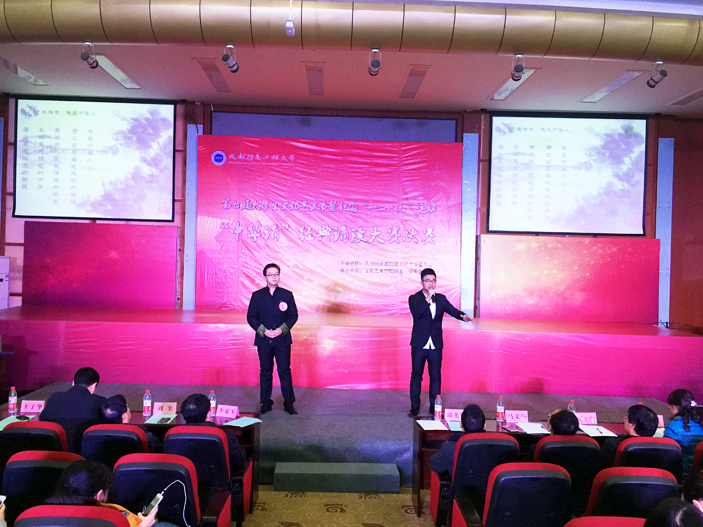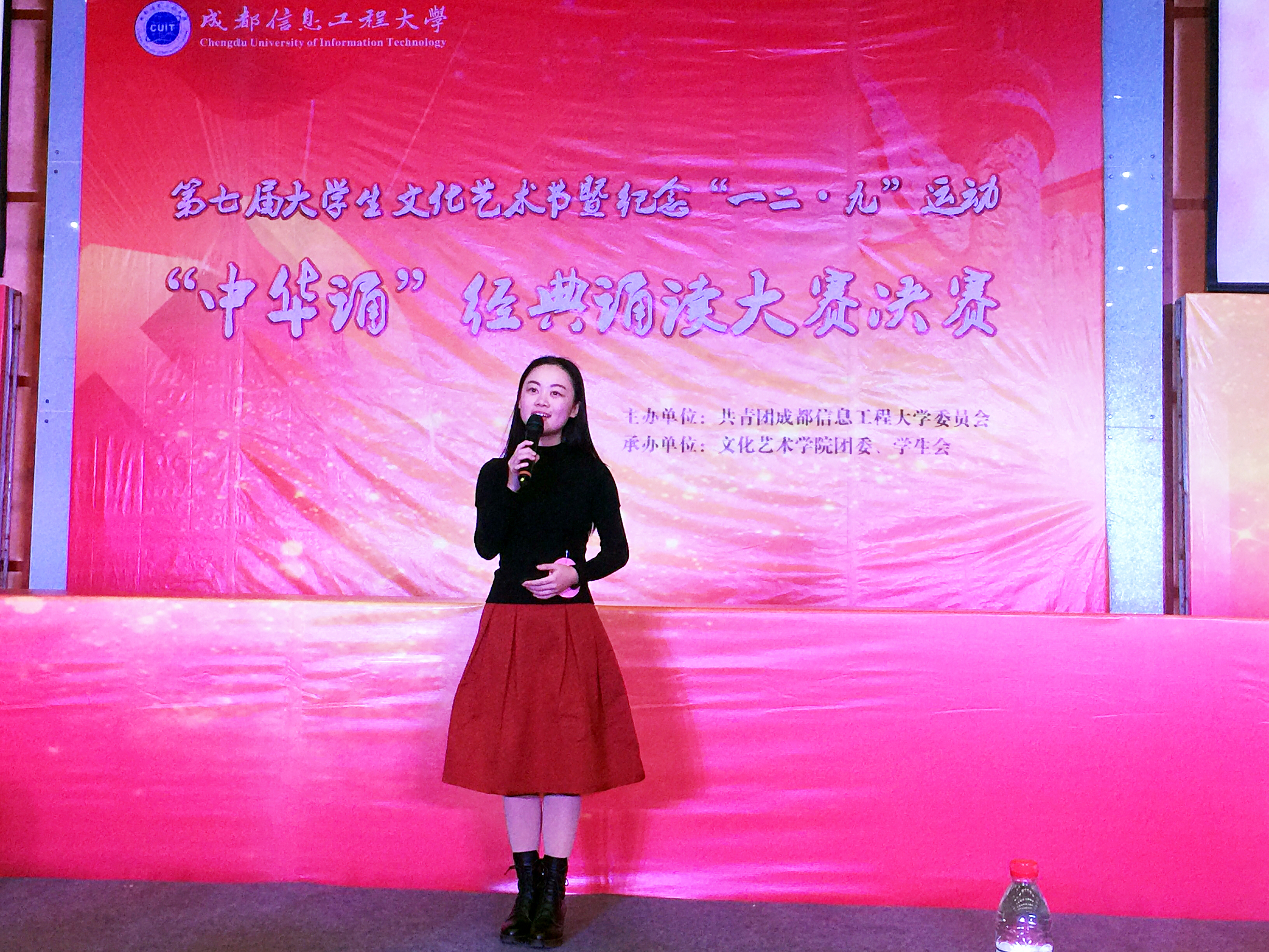 【本网讯】五千年大浪淘沙,多少历史华章沉淀着岁月芳香。吟诗歌,诵中华,筑梦中国。为弘扬爱国主义精神和中华优秀传统文化,进一步浓郁校园文化氛围,提升校园文化品位,激励成信学子在报效祖国的征程中树立民族自信心,奋发有为,12月9日,学校在龙泉校区学术报告厅隆重举行伟德官网第七届大学生文化艺术节暨纪念“一二.九”爱国学生运动80周年之“中华诵”经典诵读大赛决赛。学生工作处、校团委、继续教育学院负责人,龙泉校区各学院党总支书记(副书记)、团委书记出席活动,与学生代表共同感受经典。活动由校团委主办,文化艺术学院团委、学生会承办。