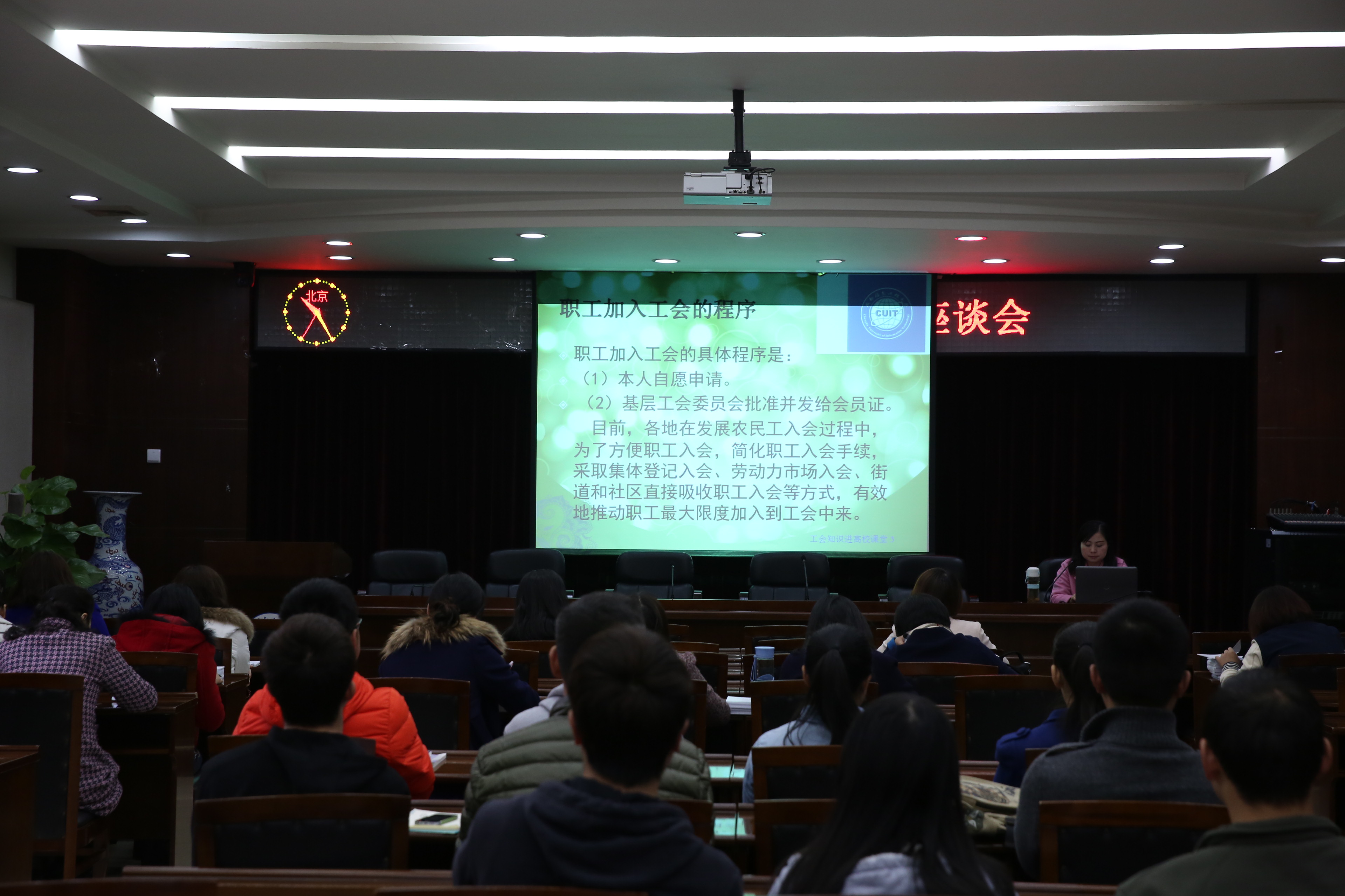 继宣传之后,11月26日校工会在行政楼第一会议室展开了以“入工会、维权益、促就业”为主题的座谈会,部分大四辅导员和就业指导课的老师,毕业学生代表参加了会议。座谈会首先是由政治学院曾利老师讲解工会的基本知识以及学生在就业中涉及到的工会法律知识,之后又通过对诸多案例的讲解使台下的老师与同学们充分理解工会知识,且耐心回答台下老师及同学们对于就业问题的疑问。随后与会人员开展的激烈的讨论,通过老师与同学们的参与及互动,座谈会圆满结束。