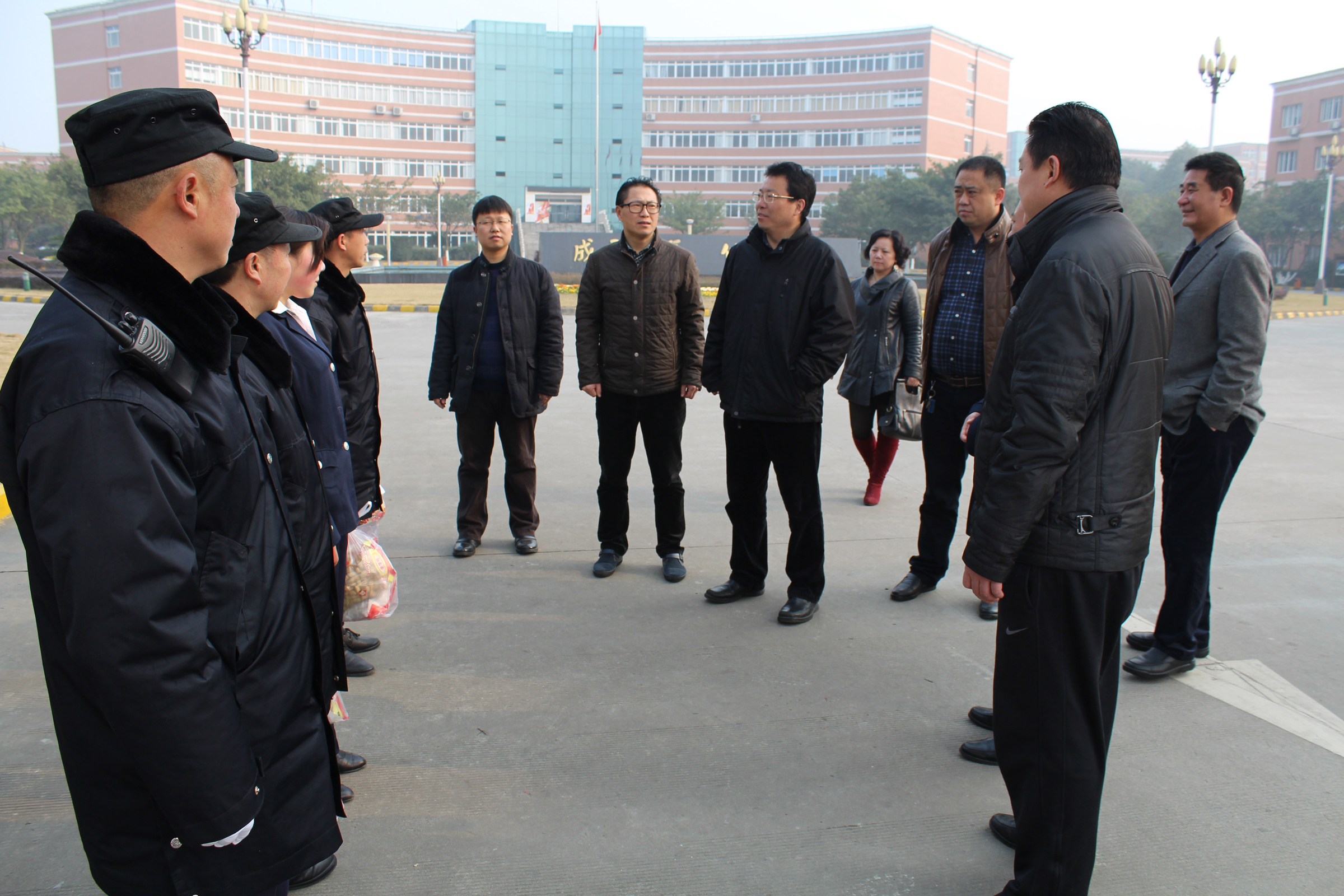 【本网讯】在2015年新春佳节来临之际,2月14日上午,赖廷谦、周激流、向武、于世祥等院领导在相关职能部门负责人的陪同下,对航空港、龙泉校区的后勤物业管理、学生宿舍、学生食堂、绿化养护工区等基层进行了走访慰问,为奋战在一线的干部职工送上节日问候和慰问品,更将浓浓的关爱和温暖,送到了全体职工的心坎里。院领导对在春节期间仍坚守在岗位上辛勤奉献的一线职工表示衷心的感谢,并致以诚挚的节日问候和美好祝愿。