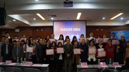 为活跃闭幕式气氛,大会安排了精彩的节目。缪怡然同学为大家带来了“英美文化”演讲;于姝宁、郭小侨同学献上了悦耳的英文歌曲,文化艺术学院再次演绎了英语原声电影配音的视听享受;罗旭辉同学的一曲《 Apologize》的优美歌声引来台下观众的阵阵欢呼。闭幕式上出席闭幕式的嘉宾为获得本届外语文化节的获奖者颁发了一、二、三等奖和优秀奖。最后,外国语学院黄驰副院长致闭幕词并宣布本次外语文化节闭幕。(来源;外国语学院 作者:刘鋆 审核:新闻中心)