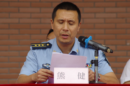 空军某部副司令员、军训团团长熊健代表承训部队作军训动员讲话,希望同学们珍惜机会、刻苦训练、互帮互助,通过训练学习军人的顽强作风、纪律观念和团队精神,并运用于学习生活中,孜孜不倦、勤学苦读,坚定远大理想,创造青春业绩。同时,熊健要求军训教官严格管理、科学施训、文明施训,确保军训工作取得圆满成功。