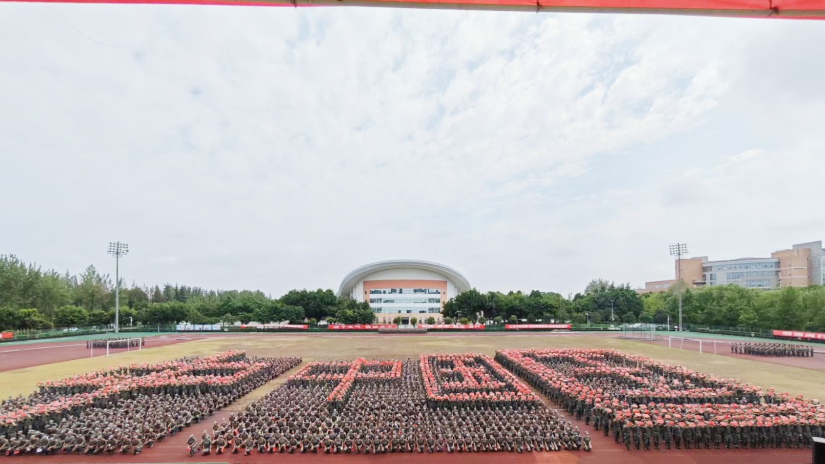 匕首操方队虎虎生威、巾帼不让须眉;军体拳方队整齐划一,酷飒中带着自信,豪迈中带着坚韧;花式方阵栩栩如生地摆出了战斗机造型,展示了学子们敢于创新,力争上游的精神面貌。同学行云流水地变换队列,展示出中国地图和“中国”“强国有我”等美观大气的队形,表达成信学子对祖国的热爱以及锐意进取、追求卓越的精神风貌。