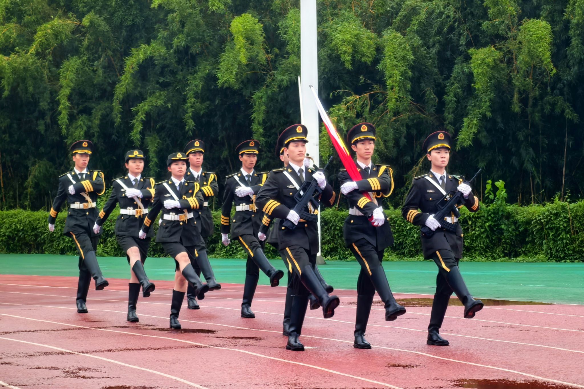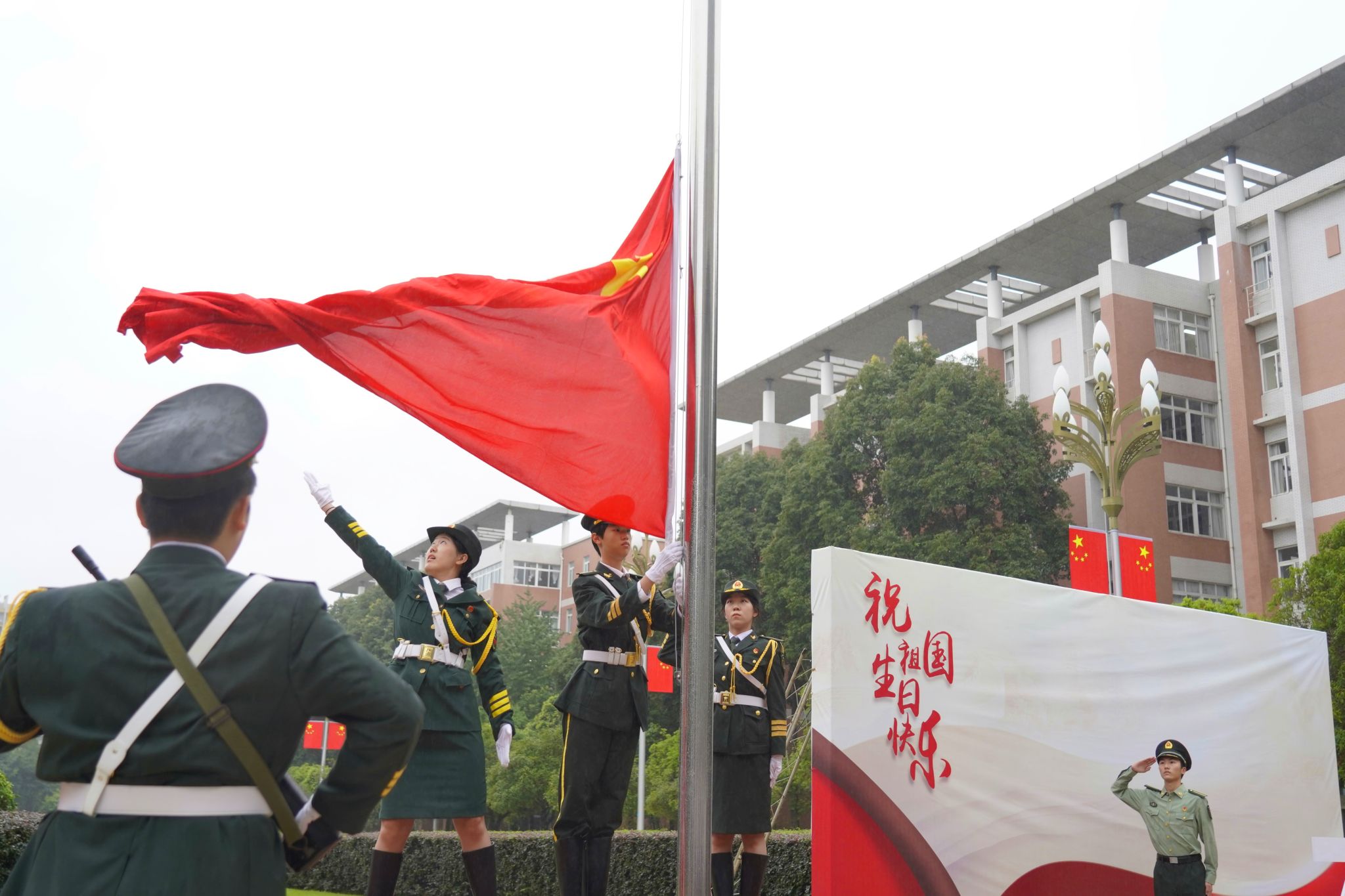 上午7时30分,升旗仪式正式开始。领导干部和师生代表在两校区升旗台前整齐列队。国旗护卫队队员以昂扬的精神、坚定的步伐护卫着国旗,走向升旗台。伴随着雄壮的国歌,五星红旗冉冉升起。全体师生庄严肃立,对祖国送上了最美好的祝福。