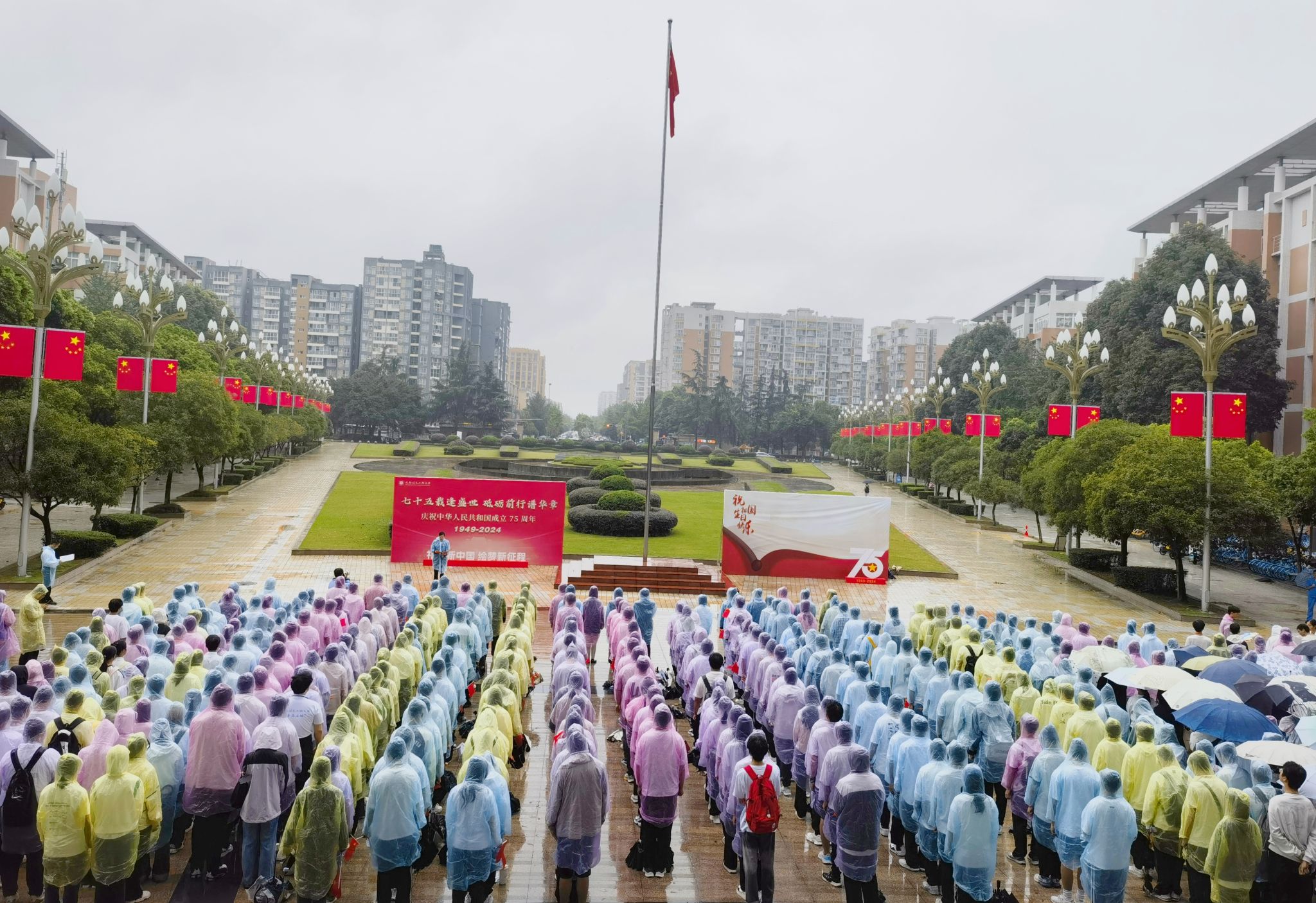 【本网讯】为庆祝中华人民共和国成立75周年,弘扬爱国主义精神,提升学生民族自豪感,激发全体师生爱国热情, 9月30日,学校在航空港校区和龙泉校区举行迎国庆升国旗仪式。学校党委书记沈火明、校长何建新,副校长罗小蓉、陈权亮,学校各单位负责人以及教师、学生代表等近1000人参加仪式。陈权亮主持升国旗仪式。