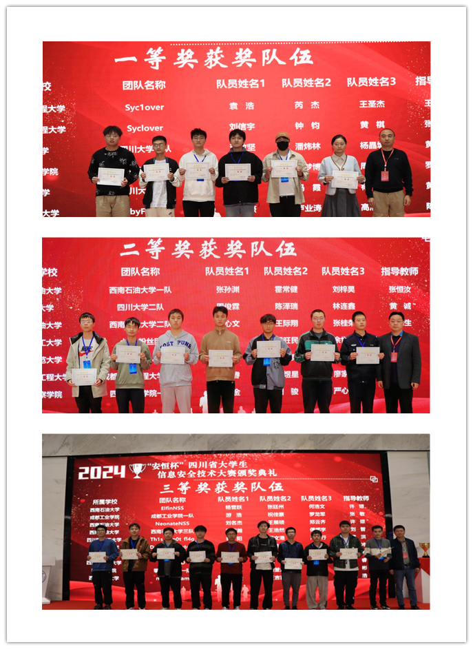 来自bv伟德国际1946的Syc1over队伍获得了本次比赛的冠军。来自bv伟德国际1946、四川大学、成都东软学院、西南民族大学、成都职业技术学院、乐山职业技术学院的9支队伍获得了本次大赛的一等奖,8名指导老师获得了优秀指导教师奖。来自西南石油大学、成都理工大学、四川师范大学、四川警察学院、绵阳城市学院、西华师范大学、成都大学、四川商务职业学院、泸州职业技术学院、绵阳职业技术学院、成都工业职业技术学院等高校的18支队伍获得了本次比赛的二等奖。来自成都工业学院、四川轻化工大学、攀枝花学院、四川传媒学院、西南科技大学、四川文理学院、中国民用航空飞行学院、四川信息职业技术学院、四川邮电职业技术学院、成都工贸职业技术学院等高校的26支队伍获得了本次比赛的三等奖。