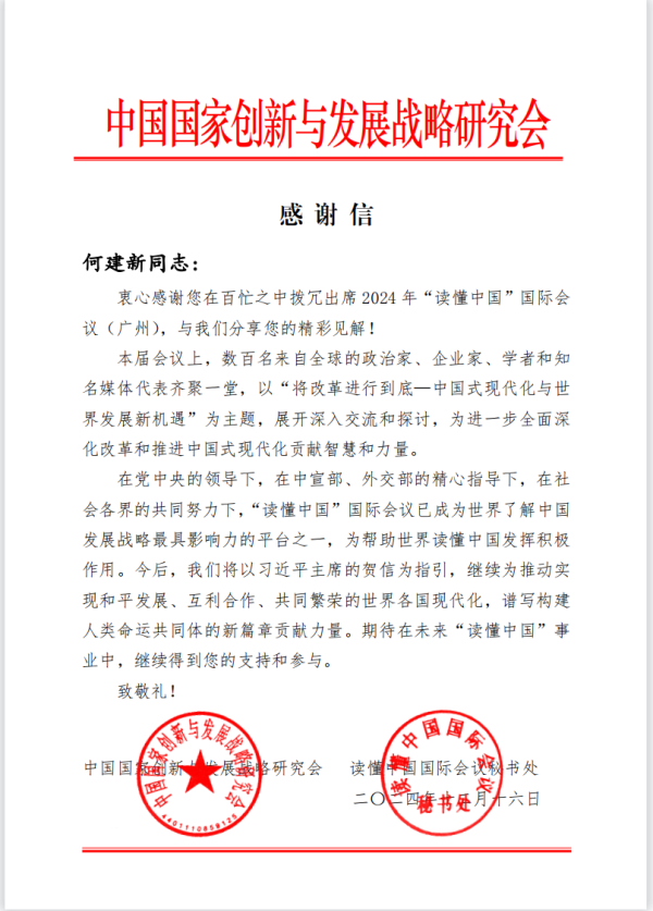 【本网讯】近日,伟德官网校长何建新收到中国国家创新与发展战略研究会、读懂中国国际会议秘书处发来的感谢信。感谢何建新出席2024年“读懂中国”国际会议(广州)并分享精彩见解。