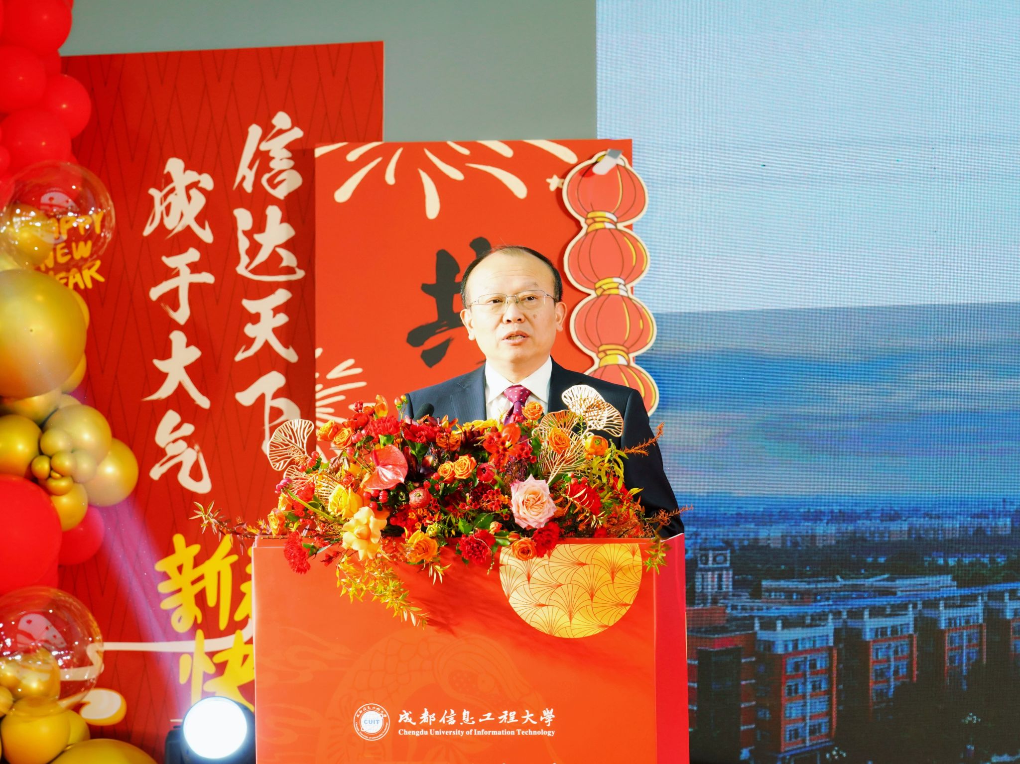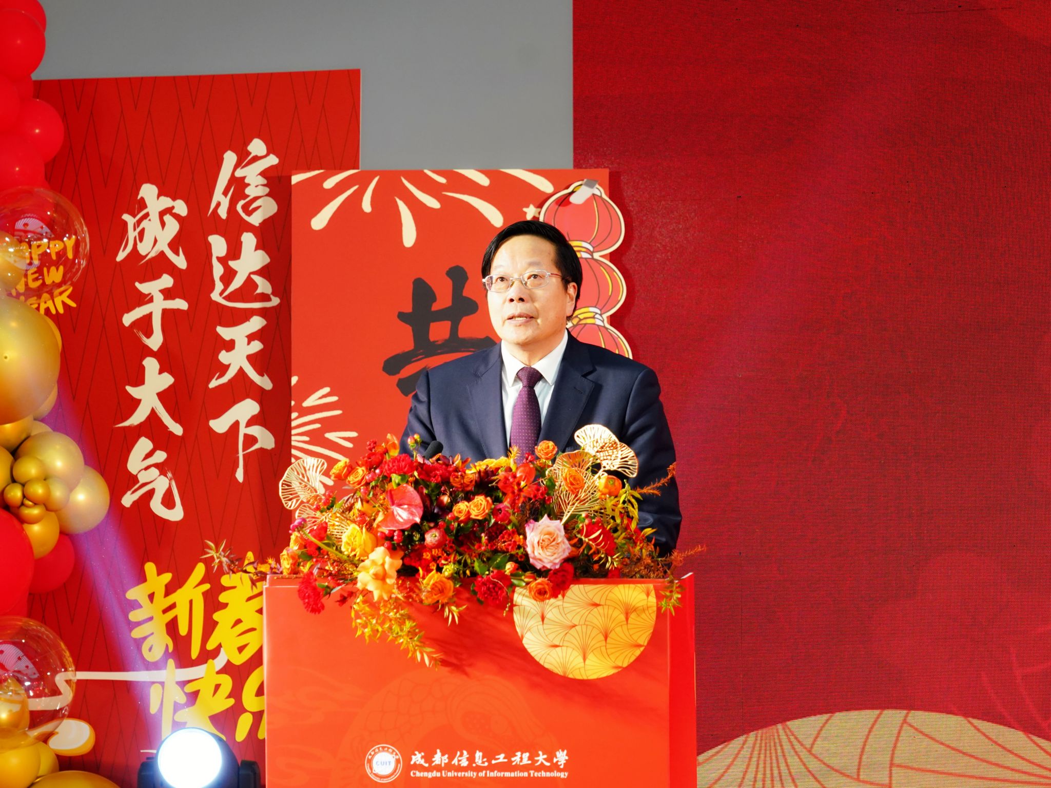党委书记沈火明代表学校向全体师生员工、离退休同志、校友以及关心学校发展的各界人士致以节日的问候和新年的祝福。他讲到,过去的一年学校以习近平新时代中国特色社会主义思想为指导,全面贯彻党的教育方针,深入落实全国、全省教育大会精神,全力推进高质量内涵式发展。全校上下同心合力、勇开新局,在学科建设、人才培养、科学研究、队伍建设、开放办学等方面取得了丰硕成果,收获诸多“高光时刻”。展望2025年,学校将加快改革创新、奋力实现跨越发展,共同谱写成信大的新篇章。