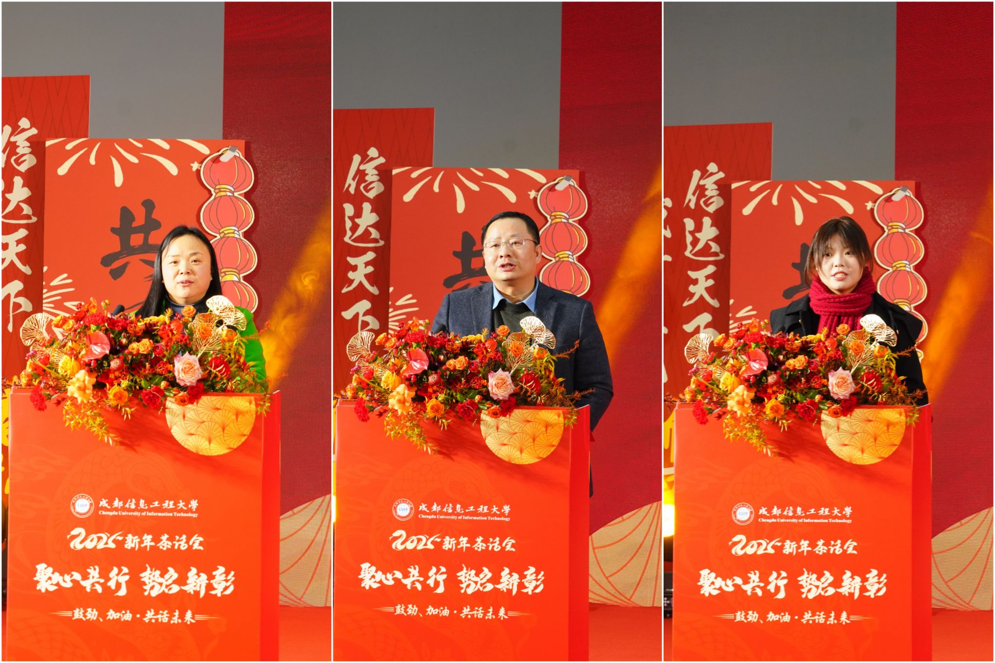 四川省优秀教师杨玲教授,全国优秀青年气象科技工作者华维教授,人工智能学院本科学生尹英姿先后作交流发言。分享了过去一年在教学、科研、管理、学习等不同领域取得的丰硕成果与个人成长,并向大家致以节日问候和诚挚祝福。