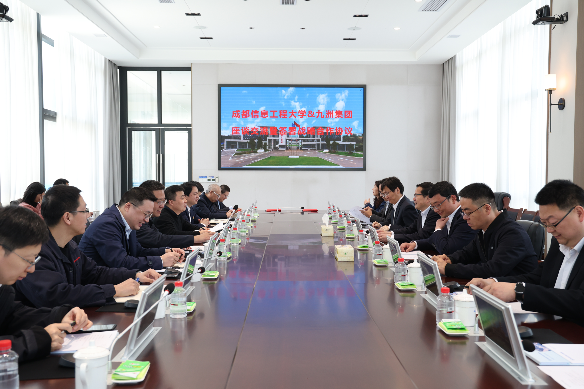 九洲集团相关部门及下属公司负责人,学校国内合作处(校友办)、教务处、科技处、电子工程学院、通信工程学院和计算机学院负责人参加了交流。