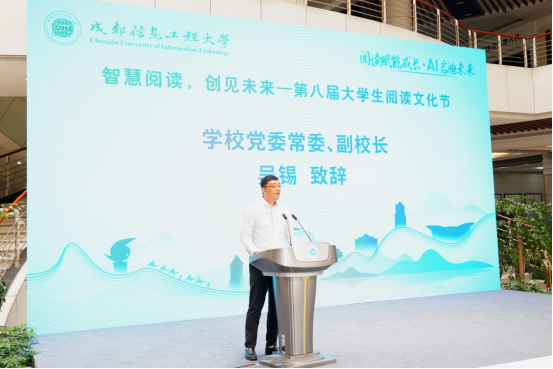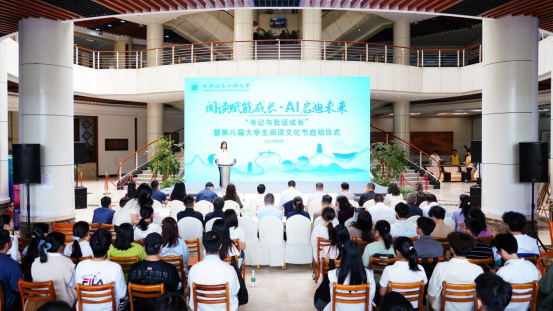 在“智慧阅读·创见未来”环节,吴锡宣布学校第八届大学生阅读文化节正式启动。他表示,本届阅读文化节紧扣学习贯彻习近平文化思想这一主线,以培根铸魂、启智润心为目标,着力引导青年学子在深学细悟中坚定文化自信,在知识汲取中厚植家国情怀,成为引领时代发展的栋梁之材。