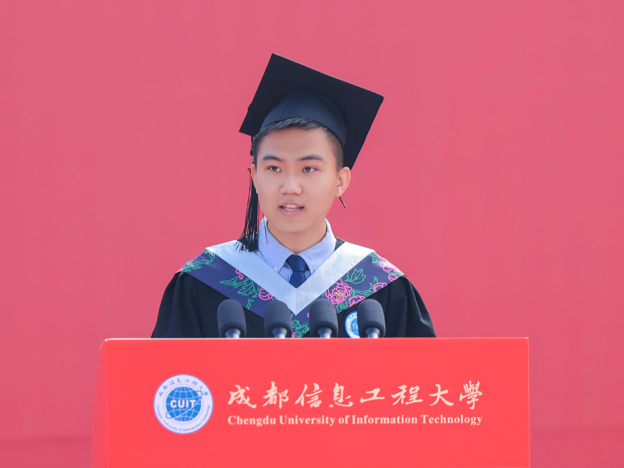 大气科学学院2025届本科毕业生冯士哲在发言中,以“破云・求真”“扎根・担当”“发光・同行”为关键词,讲述他在学校“气象+”培养体系下掌握专业技能、参与凉山气象科普支教等经历,感谢学校“三全育人”理念赋予追梦力量。他鼓励毕业生牢记使命,以创新魄力和广阔胸怀在新时代书写华章。