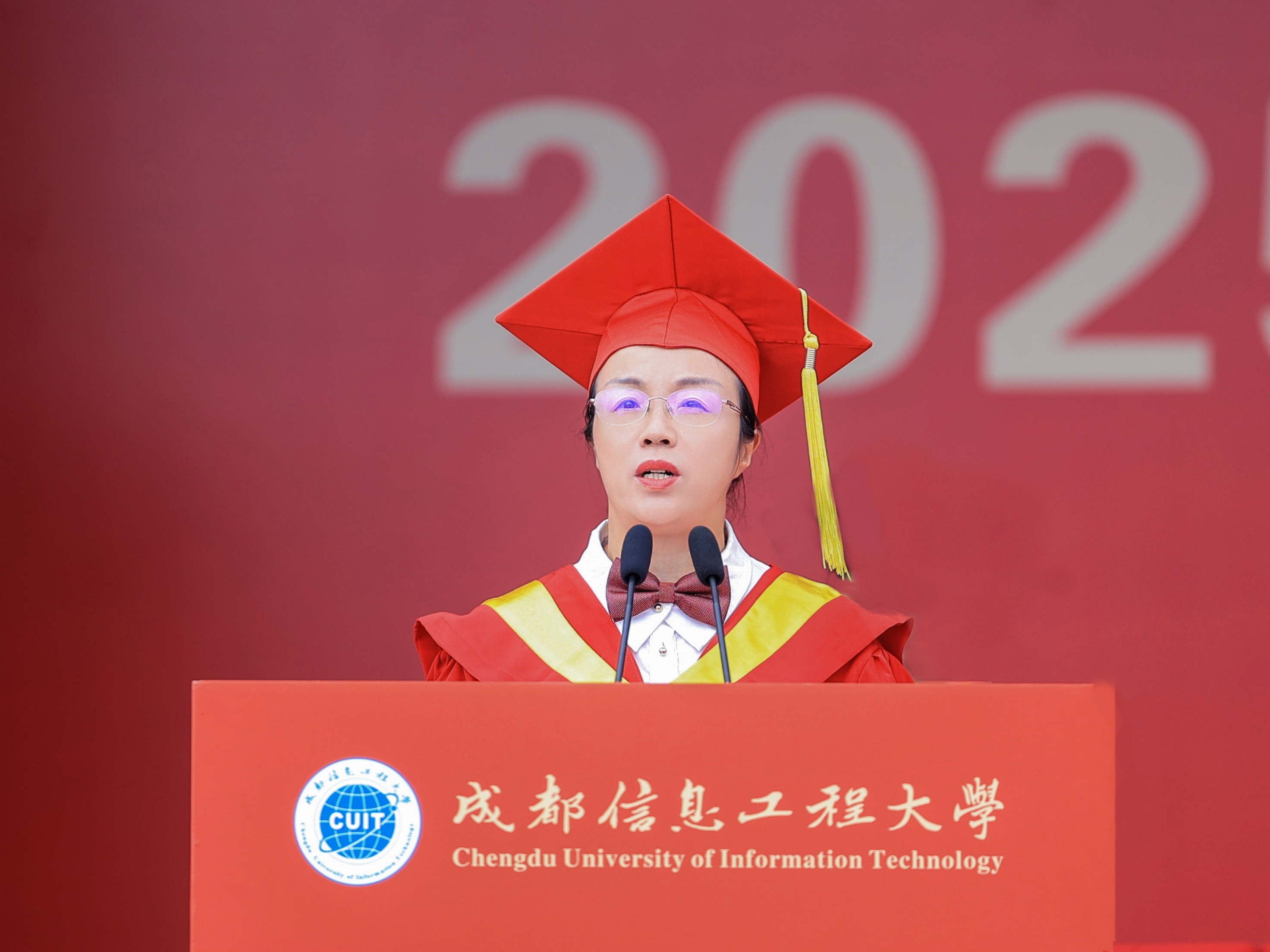 罗小蓉宣读了准予2025届学生毕业及授位的文件。她祝贺1101名硕士研究生、5100名本科学生同学们顺利毕业并获得学位。