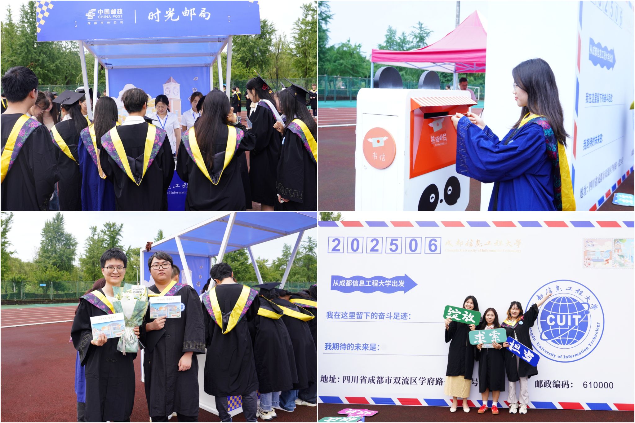 学校联系中国邮政在两校区毕业典礼会场设立“时光邮局”。毕业生可免费寄送时光邮件,向未来的自己或家人、朋友、师生传递心意,留存独特纪念。学校希望同学们怀揣感恩之心开启新征程,铭记母校温暖与成信记忆。