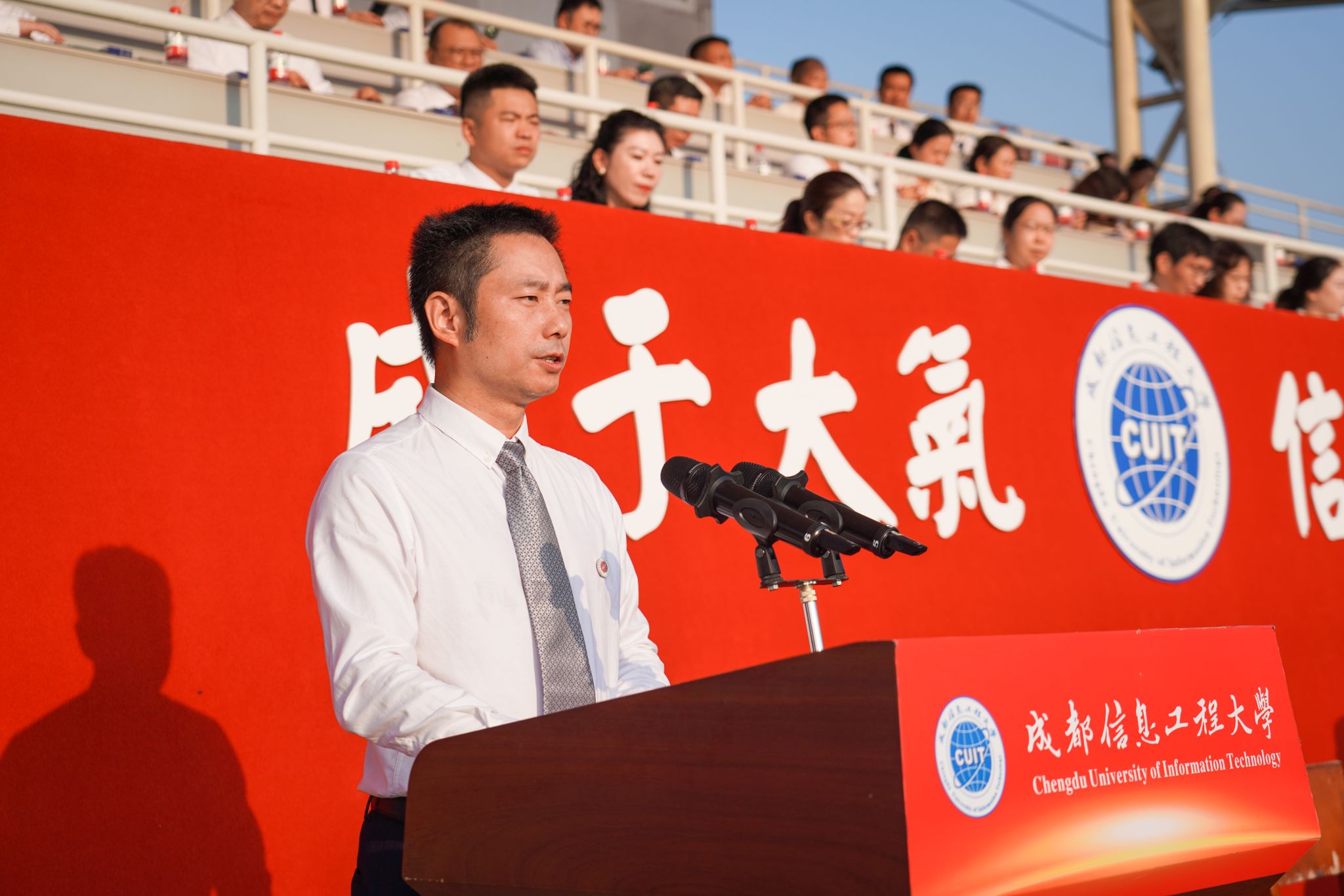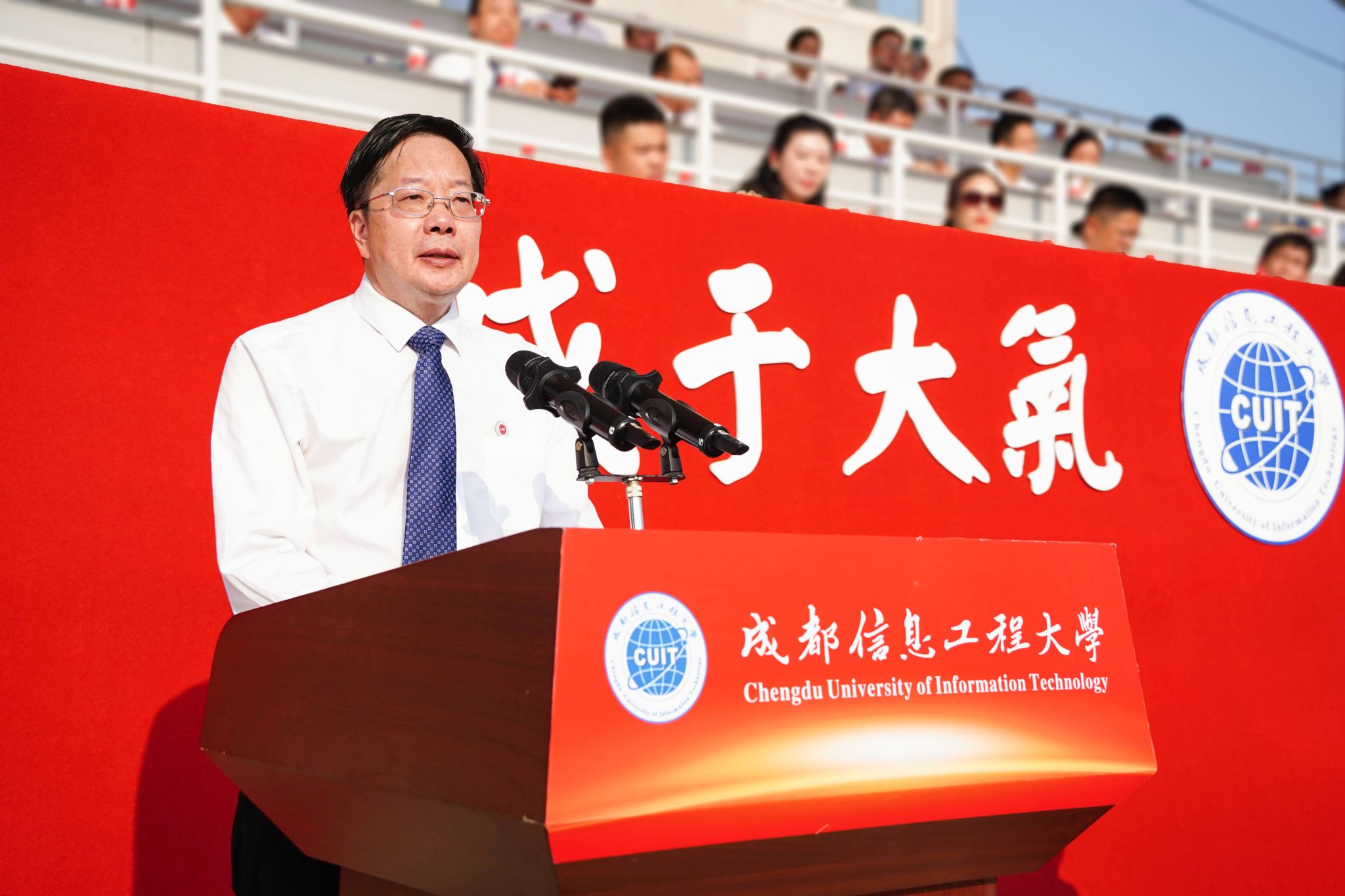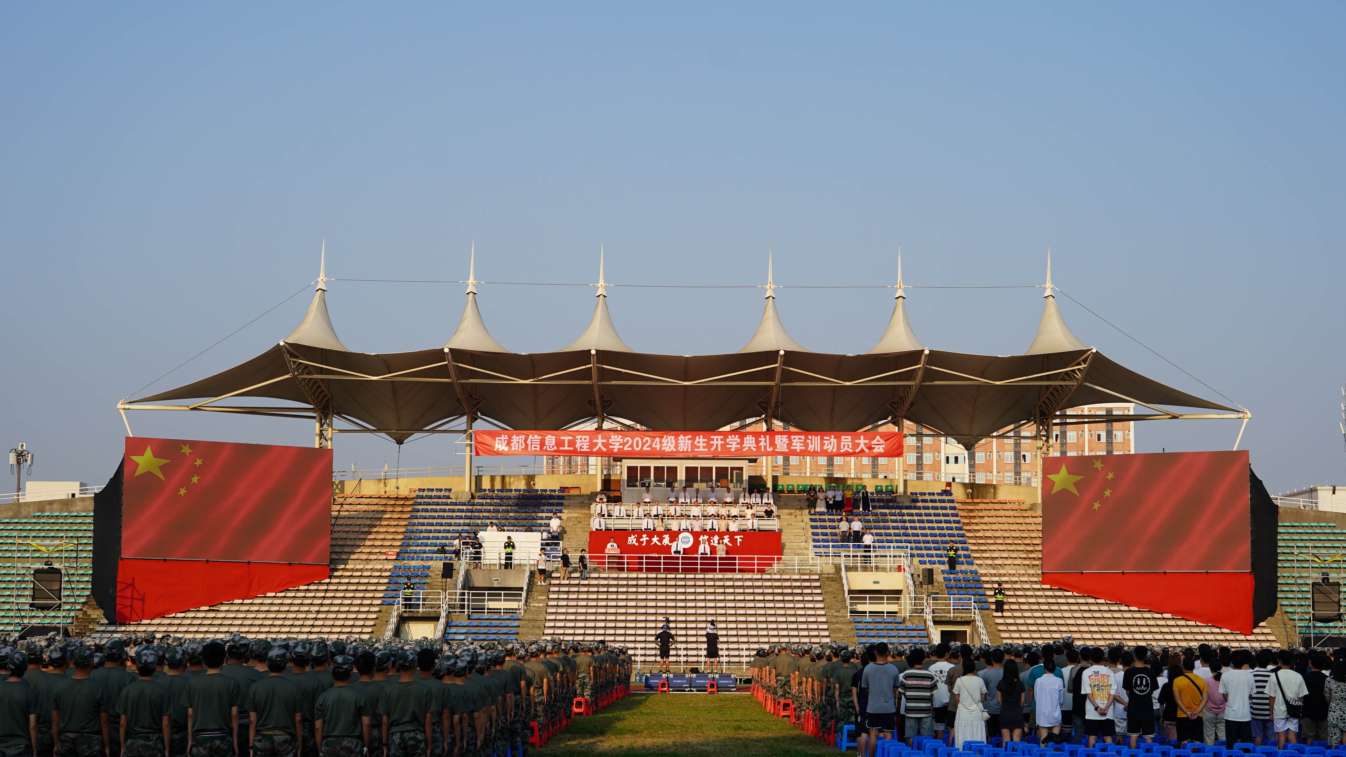 【本网讯】长空旭日蓄势待发,成信学子昂扬振奋。9月2日清晨,学校2024级新生开学典礼暨军训动员大会在航空港校区第二田径场和龙泉校区大礼堂盛大举行。大会现场两校区活动盛况网络同步直播。学校领导,相关职能部门负责人,各学院党委书记(副书记)、院长,2024级学生辅导员,2024级全体学生参加典礼。学校副校长陈权亮主持开学典礼。