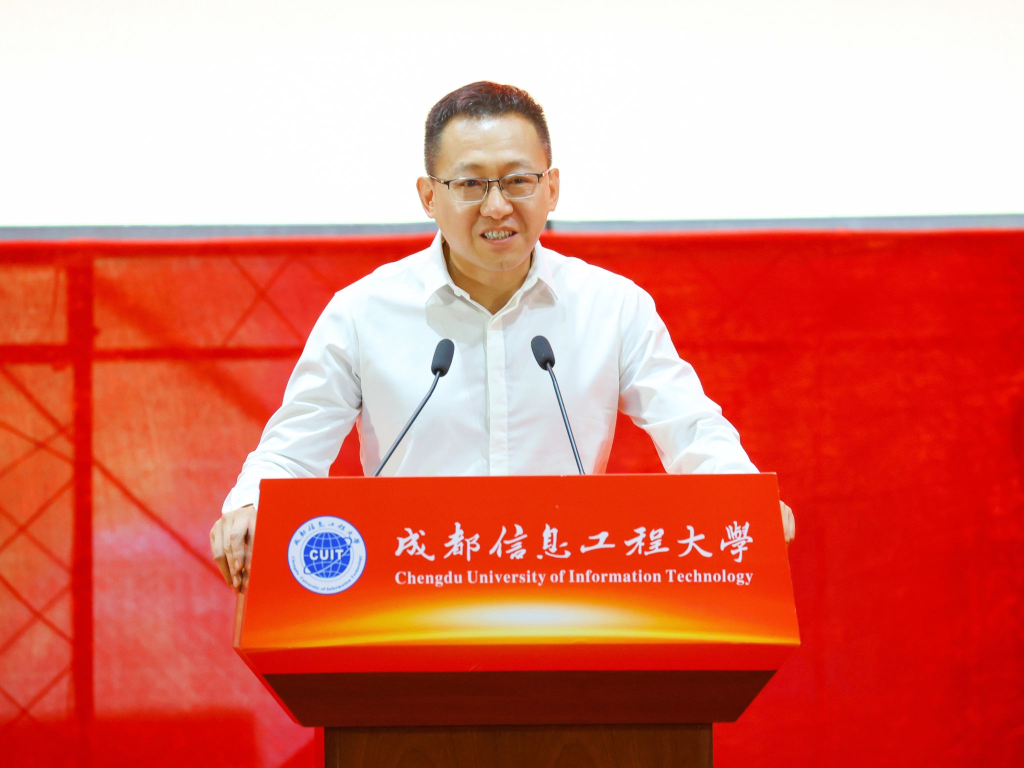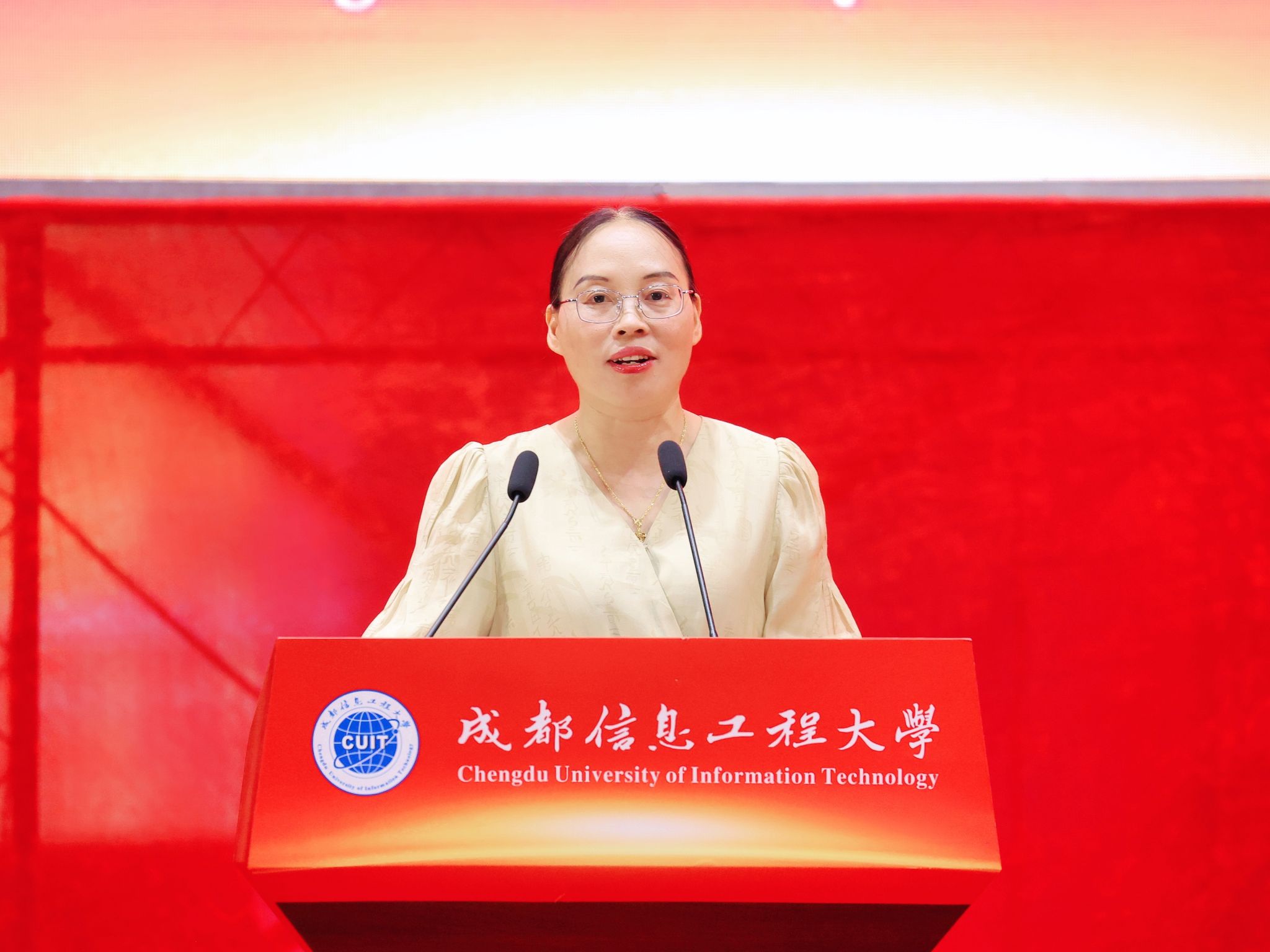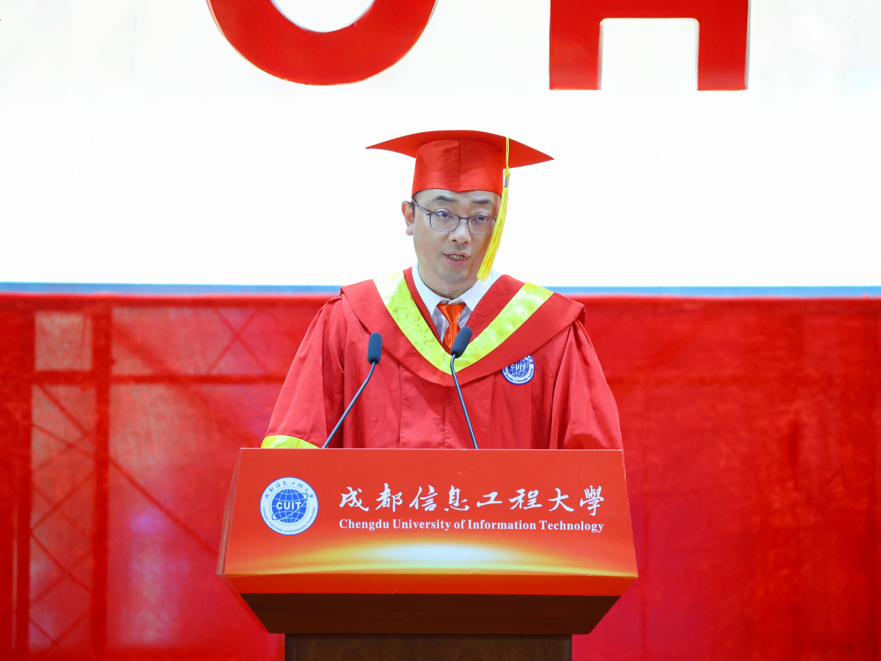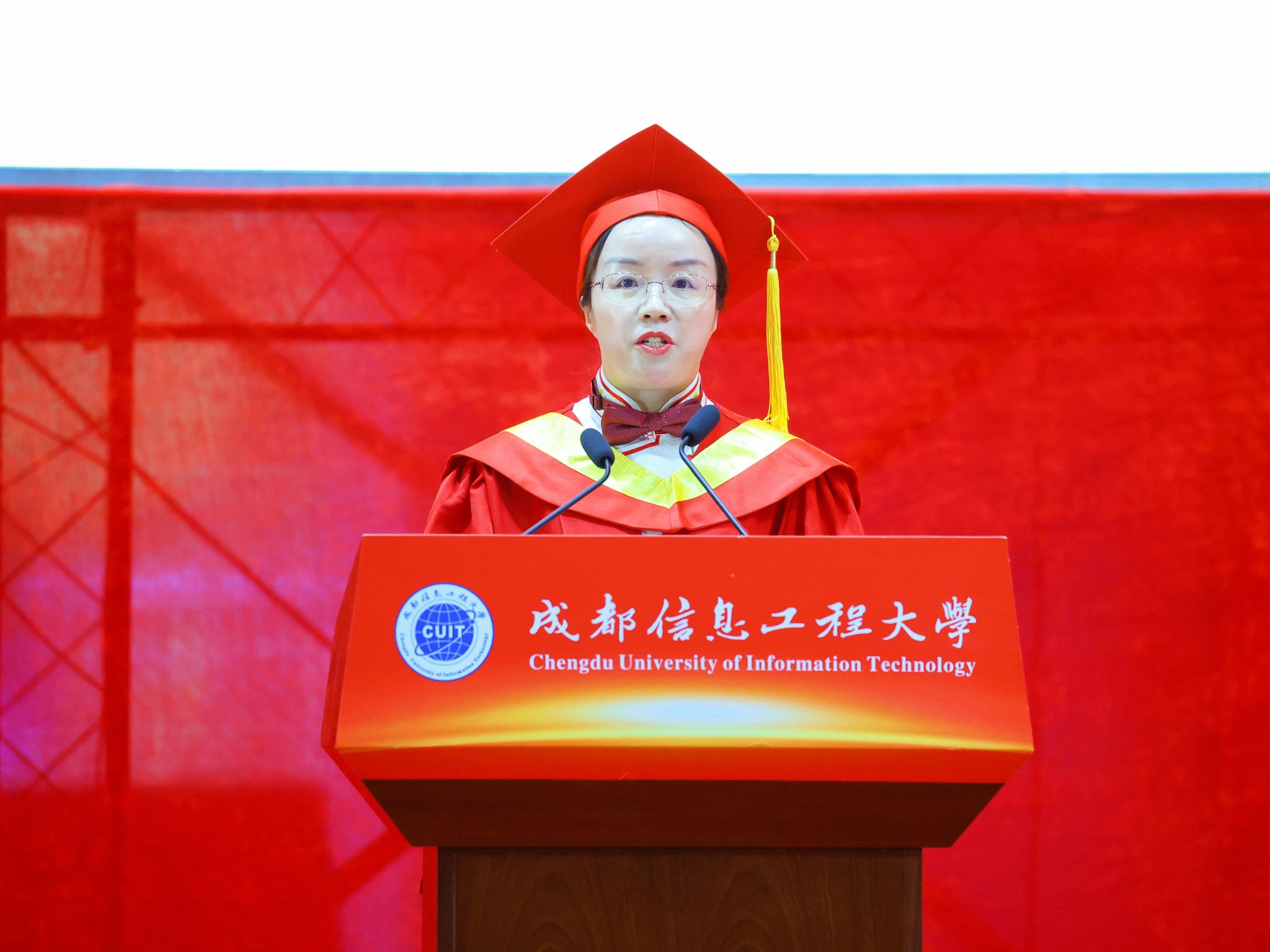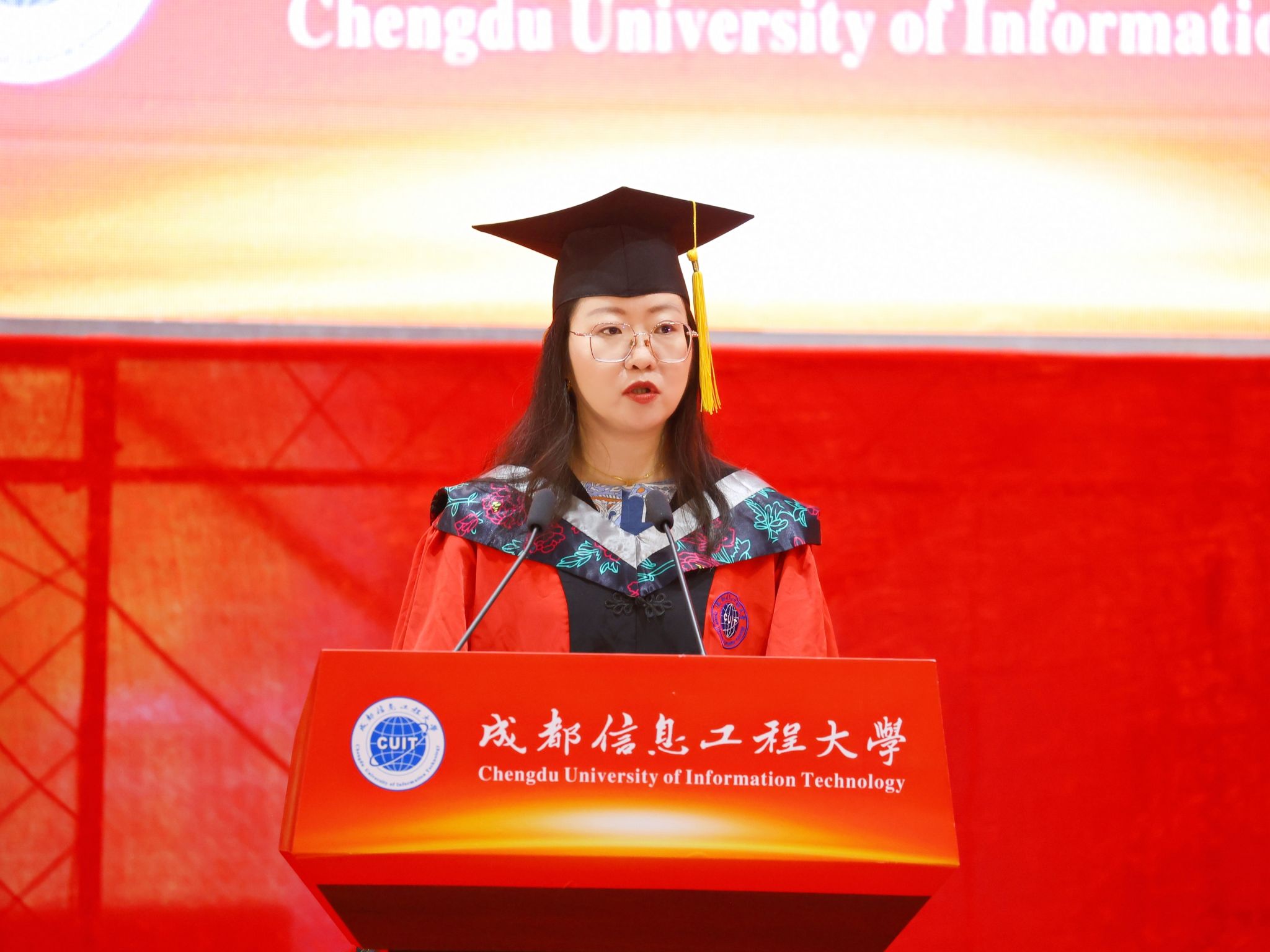 四川省首届“四有”好老师、学校首届“最受学生欢迎教师”奖获得者大气科学学院教授陈科艺作为教师代表发言。她寄语毕业生同学们要热爱自己的事业,勇于逐梦、不畏困难;活到老,学到老。她祝贺2024届成信学子毕业快乐,希望大家初心如磐,奋楫前行,成就一番波澜壮阔。