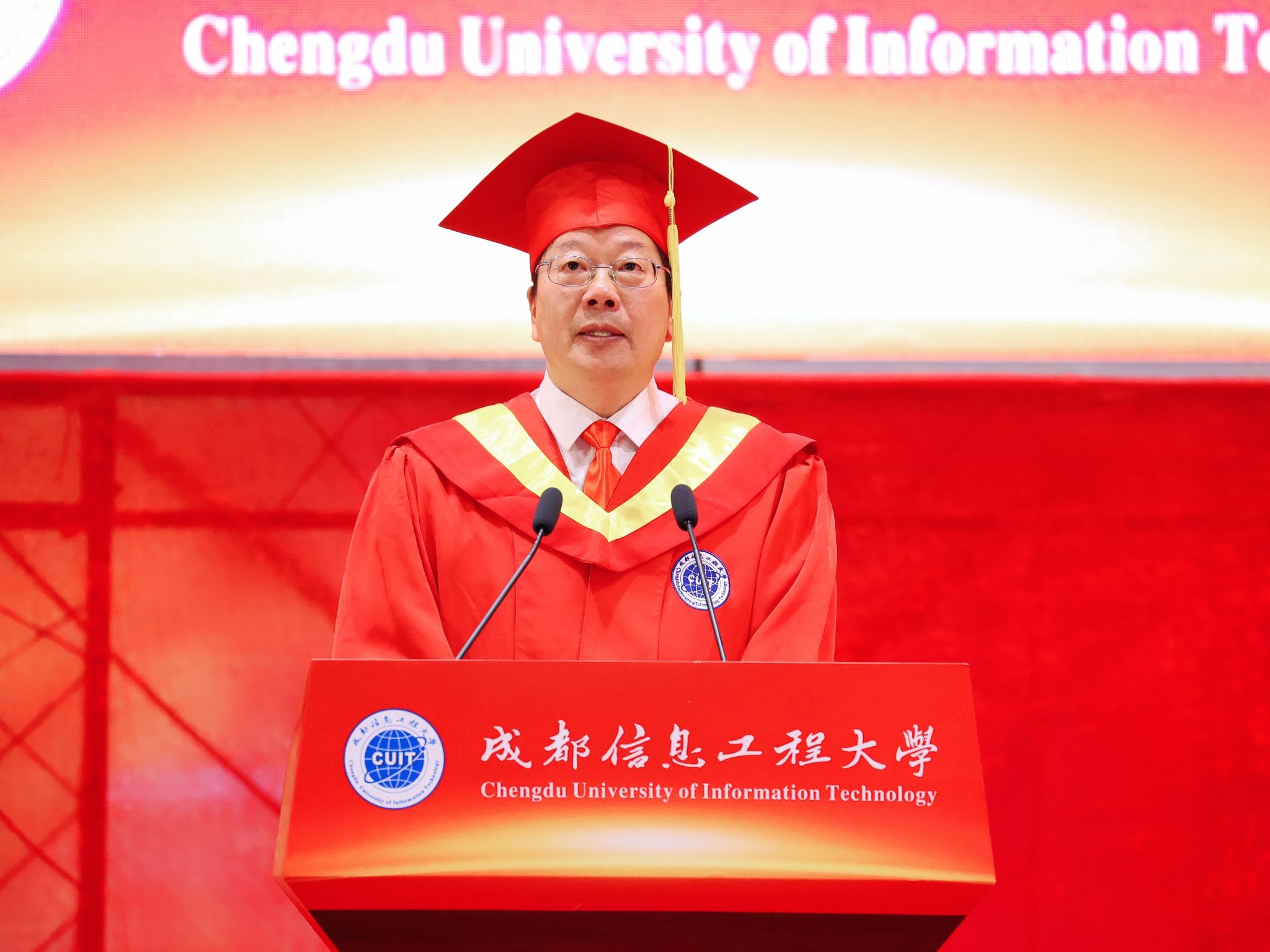何建新作了题为《大气有为、赤诚坦荡、勇战善成做好“成信”精神践行者》的讲话。他代表全校师生员工,热烈祝贺2024届毕业生学有所成、焕新起航,并向全校教职员工、家长和亲友致以诚挚的敬意和衷心的感谢!他讲述了学校的历史变迁与改革发展,希望毕业生传承与延续成信精神,既仰望星空,以更高的标准要求自己,成长成才;又脚踏实地,在祖国最需要的地方,服务社会、造福人民。他分享了优秀校友科技报国的故事,殷切希望毕业生们在面对未来的风险与挑战时,增强志气,做大气有为的成信人;提升正气,做赤诚坦荡的成信人;保持锐气,做勇战善成的成信人。他勉励毕业生用“成信”精神照亮人生前行的方向,树立远大志向,锤炼坚韧意志,保持奋进姿态,勇做开路先锋和事业闯将,努力在推进强国建设、实现民族复兴的接续奋斗中展现青春力量,放飞人生梦想,成就事业华章!