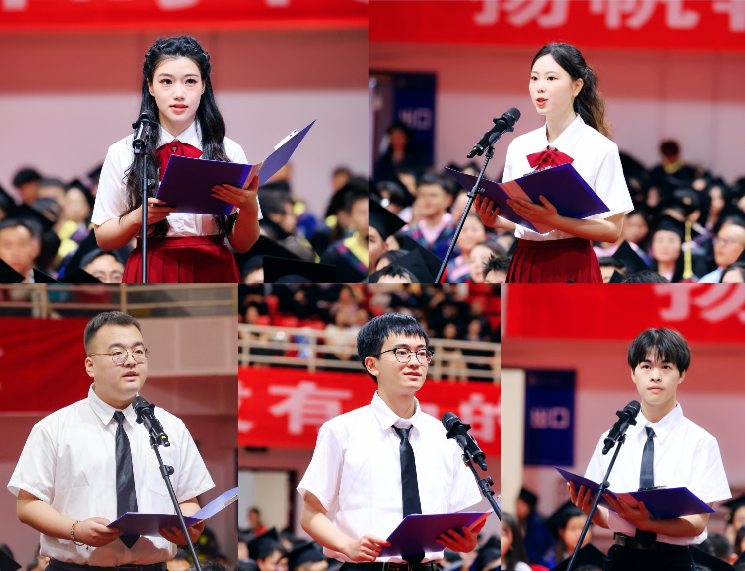 来自软件工程学院任浩浩、电子工程学院陶星宇、计算机学院李芃锐、管理学院贺诗敏、网络空间安全学院蓝伟栩五位毕业生代表诵读了《总想对你说》。在诵读中,他们分享了在校学习生活的成长感悟,表达了对学校的培养和辛勤付出的学校领导及教职员工的崇高敬意。他们代表2024届毕业生庄重承诺请党放心、请祖国放心、请人民放心、请母校放心,将继续发扬“成于大气、信达天下”的精神,在实现中华民族伟大复兴的中国梦征途上,处处彰显成信力量。