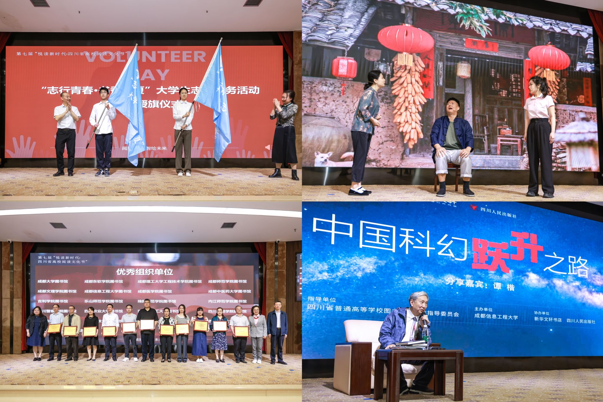 现场发布了第七届“悦读新时代:四川高校阅读文化节”主题及内容,举行了“志行青春·书香蜀夏”志愿服务活动启动授旗仪式、2023年四川省大学生信息素养大赛颁奖仪式。伟德官网学生进行了“立体阅读”作品《向天要借丰收雨》展演。特邀专家、原《科幻杂志社》总编谭楷先生以《中国科幻跃升之路》为题开展了讲座。