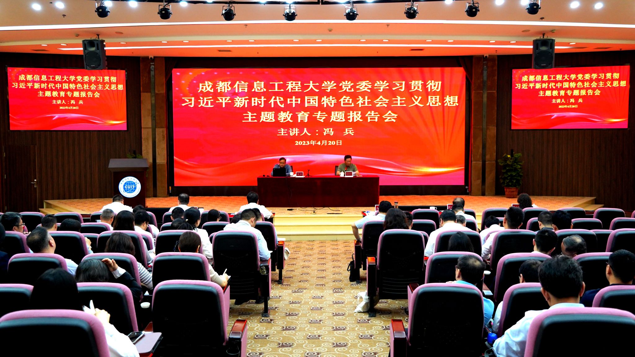 【本网讯】4月20日上午,学校在国际会议厅举行学习贯彻习近平新时代中国特色社会主义思想主题教育党委读书班专题报告会,特邀四川大学冯兵教授来校作题为《深入学习领会习近平新时代中国特色社会主义思想的世界观和方法论》的专题报告。校级领导班子成员参加了报告会,全体中层干部列席报告会,报告会由学校党委副书记马洪江主持。