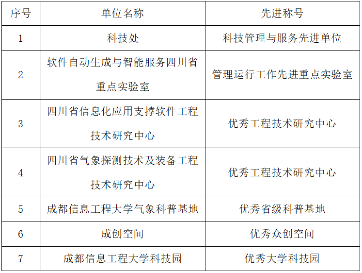 会上对2022年度科技创新工作成效突出的41家部门(单位)以及有关市(州)科技局、园区、平台予以通报表扬。在部门(单位)先进表彰名单中,学校科技处获“科技管理与服务先进单位”,此次共有川大、电子科大等10所高校的科研管理部门获得表彰;在平台先进表彰名单中,软件自动生成与智能服务四川省重点实验室获“管理运行工作先进重点实验室”,四川省信息化应用支撑软件工程技术研究中心、四川省气象探测技术及装备工程技术研究中心获“优秀工程技术研究中心”,bv伟德国际1946气象科普基地荣获“优秀省级科普基地”,成创空间获“优秀众创空间”,bv伟德国际1946科技园获“优秀大学科技园”(此次共有西南交大、电子科大等8所高校的大学科技园入选)。