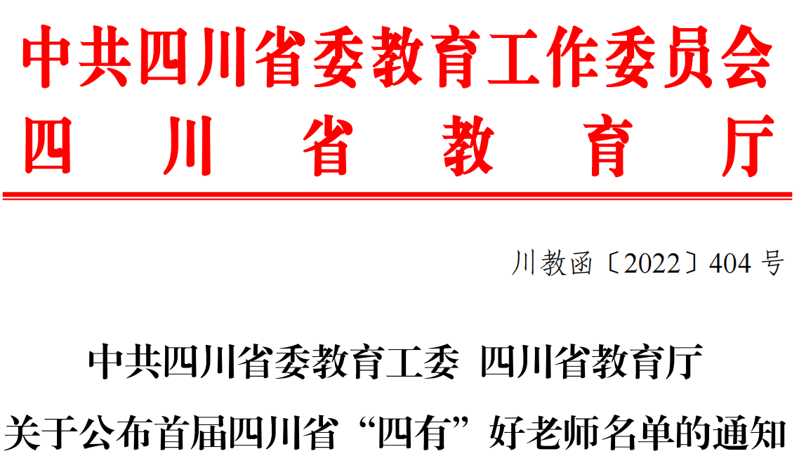 为热烈庆祝第38个教师节,充分展示新时代人民教师教书育人的动人风采和先进事迹,进一步营造全社会尊师重教的浓厚氛围,不断激励广大教师以实际行动迎接党的二十大胜利召开,中共四川省委教育工委、四川省教育厅组织开展了首届四川省“四有”好老师评选工作,经各地各校民主推荐、严格把关、层层遴选,伟德官网陈科艺教授及全省从事教育教学工作者共200名同志被评为首届四川省“四有”好老师。