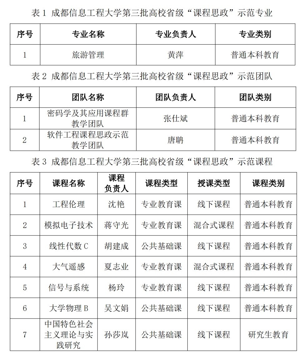 伟德官网旅游管理专业被认定为省级“课程思政”示范专业;密码学及其应用课程群教学团队、软件工程课程思政示范教学团队被认定为省级“课程思政”示范教学团队;《工程伦理》《模拟电子技术》《线性代数C》《大气遥感》《信号与系统》《大学物理B》《中国特色社会主义理论与实践研究》7门课程被认定为省级“课程思政”示范课程,其中《中国特色社会主义理论与实践研究》为研究生教育课程。详见下表。