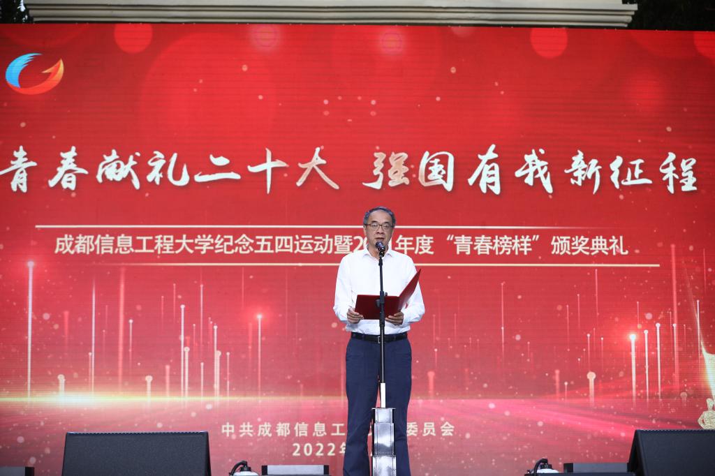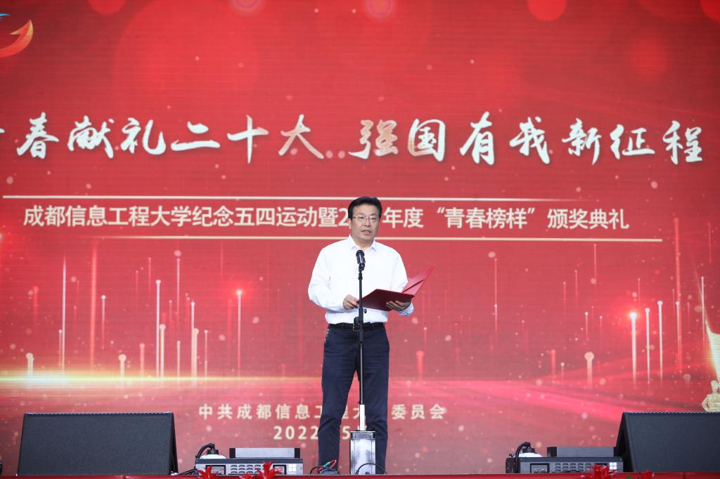 周激流在颁奖典礼上致辞。他代表学校党委和行政向受到表彰的先进个人和集体表示祝贺,向长期致力于“为党育人、为国育才”的教职员工表示感谢,向广大热爱祖国和人民,努力拼搏、青春昂扬,永远跟党走的成信青年学子致以节日的问候。他提到,表彰2021年度“青春榜样”,就是要弘扬五四精神,发扬爱国热情,牢固树立远大理想,用榜样的力量激励广大成信学子拼搏进取、成就自我。他希望,身逢伟大时代的广大成信学子深刻领会、准确把握时代赋予当代青年的责任,要热爱伟大祖国、树立远大理想,牢记习近平总书记的谆谆嘱托和殷切期望,做党的科学理论的学习者、传播者、实践者;要担当时代责任、勇于砥砺奋斗,做新时代中国特色社会主义事业的参与者、实践者,做一名快乐的追梦人、懂得感恩的奋斗者;要练就过硬本领、锤炼品德修为,以时不我待的紧迫感,积极主动学习新知识、新思想,争做德才兼备、知行合一的新时代中国青年。他号召成信学子秉承“成于大气、信达天下”的校训精神,情系国家、放飞青春梦想、书写人生华章,为建设开放的特色鲜明的高水平bv伟德国际1946、为实现中华民族伟大复兴的中国梦贡献青春力量。