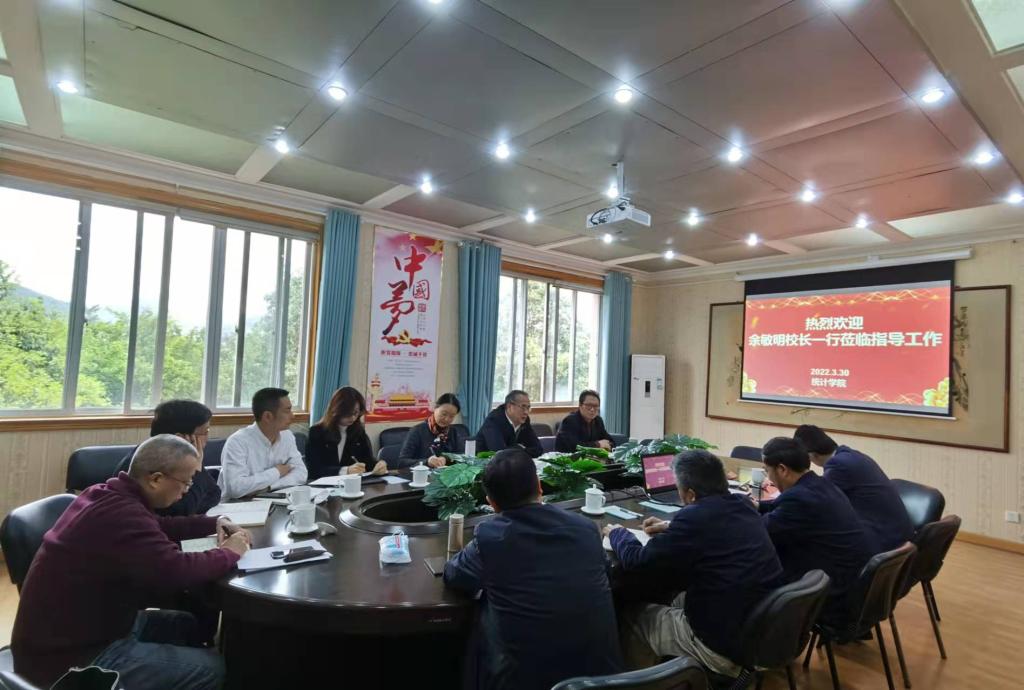【本网讯】3月30日下午,学校校长余敏明带队到统计学院进行调研并指导工作。副校长于世祥,党委办公室、校长办公室、党委教师工作部(人事处)、发展规划处、教务处、研究生处、科技处等职能部门负责人,统计学院党政班子成员、科级干部、各系主任、实验室主任等参加了调研座谈会。