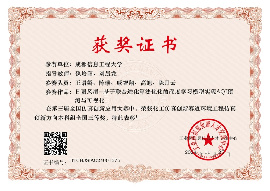 2024年12月,全国仿真创新应用大赛在西安西北工业大学落下帷幕。来自全国422所高校、企业、医学科学单位、军事科学单位及仿真领域的科研院所的1300余支队伍参加比赛。经评审专家初评、参赛团队分组线上答辩、线下仲裁等环节,在“环境工程仿真创新”赛道上最终评选出5件一等奖作品、4件二等奖作品、9件三等奖作品。由伟德官网魏培阳、刘晨龙老师指导,软件工程学院王语嫣、陈曦、戚智翔,通信工程学院高旭,资源环境学院陈丹云等5位同学提交的作品《日丽风清—基于联合进化算法优化的深度学习模型实现AQI预测与可视化》斩获全国三等奖。