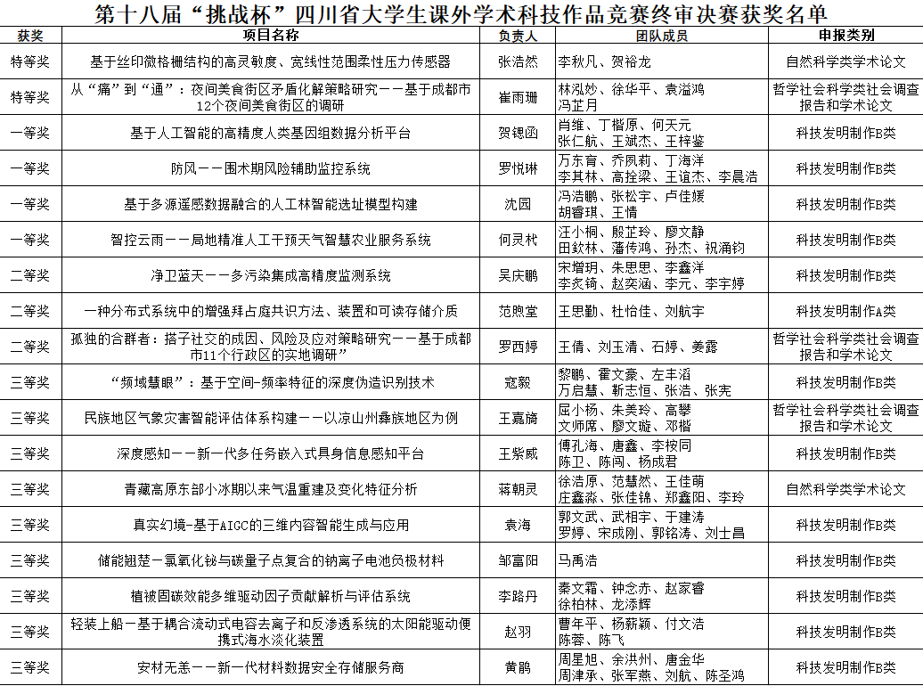 此次“挑战杯”四川省大学生课外学术科技作品竞赛取得佳绩,不仅是对伟德官网师生科研创新能力的肯定,更是伟德官网长期以来重视人才培养、注重学术创新成果的体现。未来,学校将继续以创新为引擎,打造更多元化的科创平台,让青春智慧在科技创新的沃土中生根发芽。