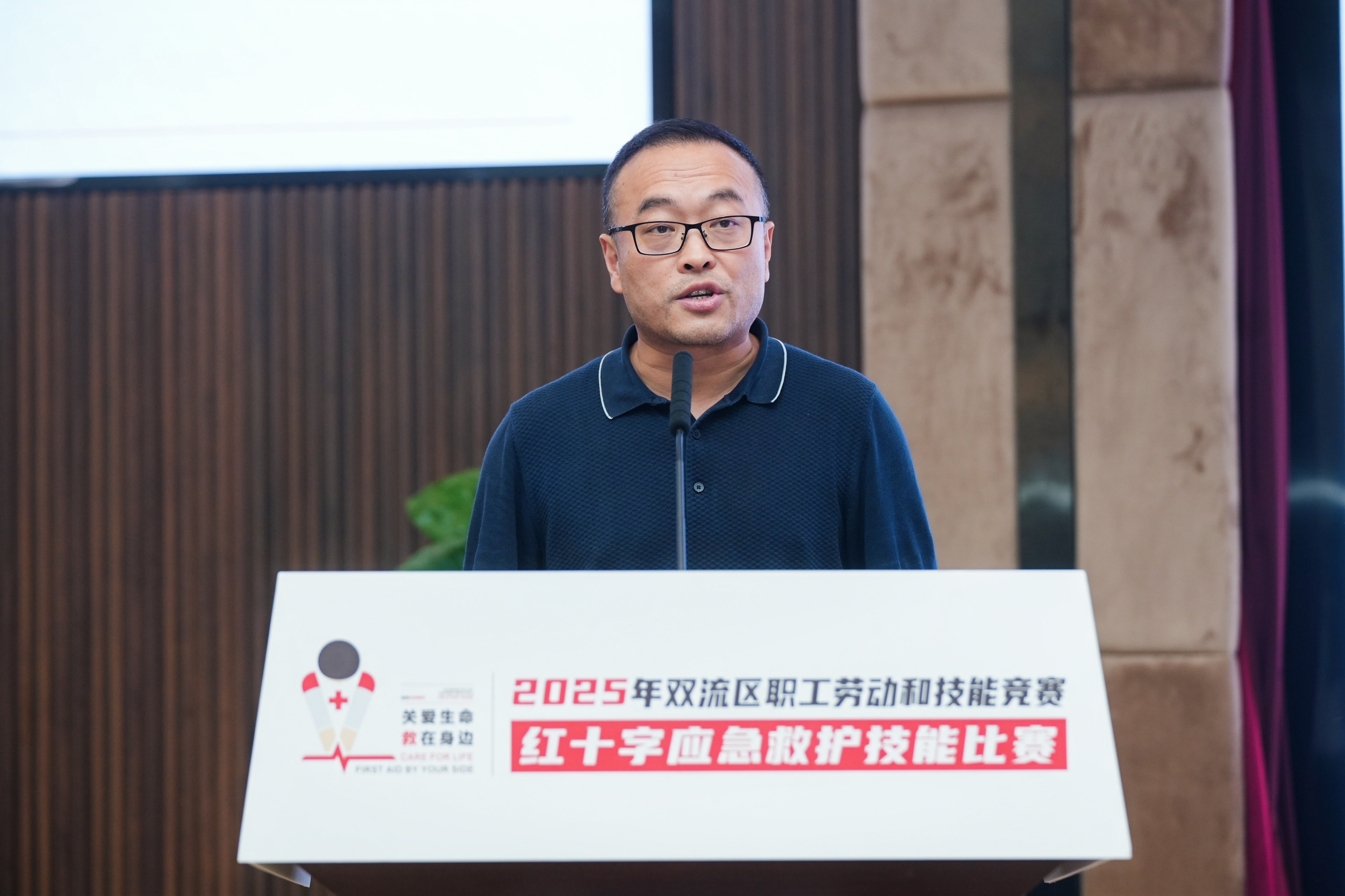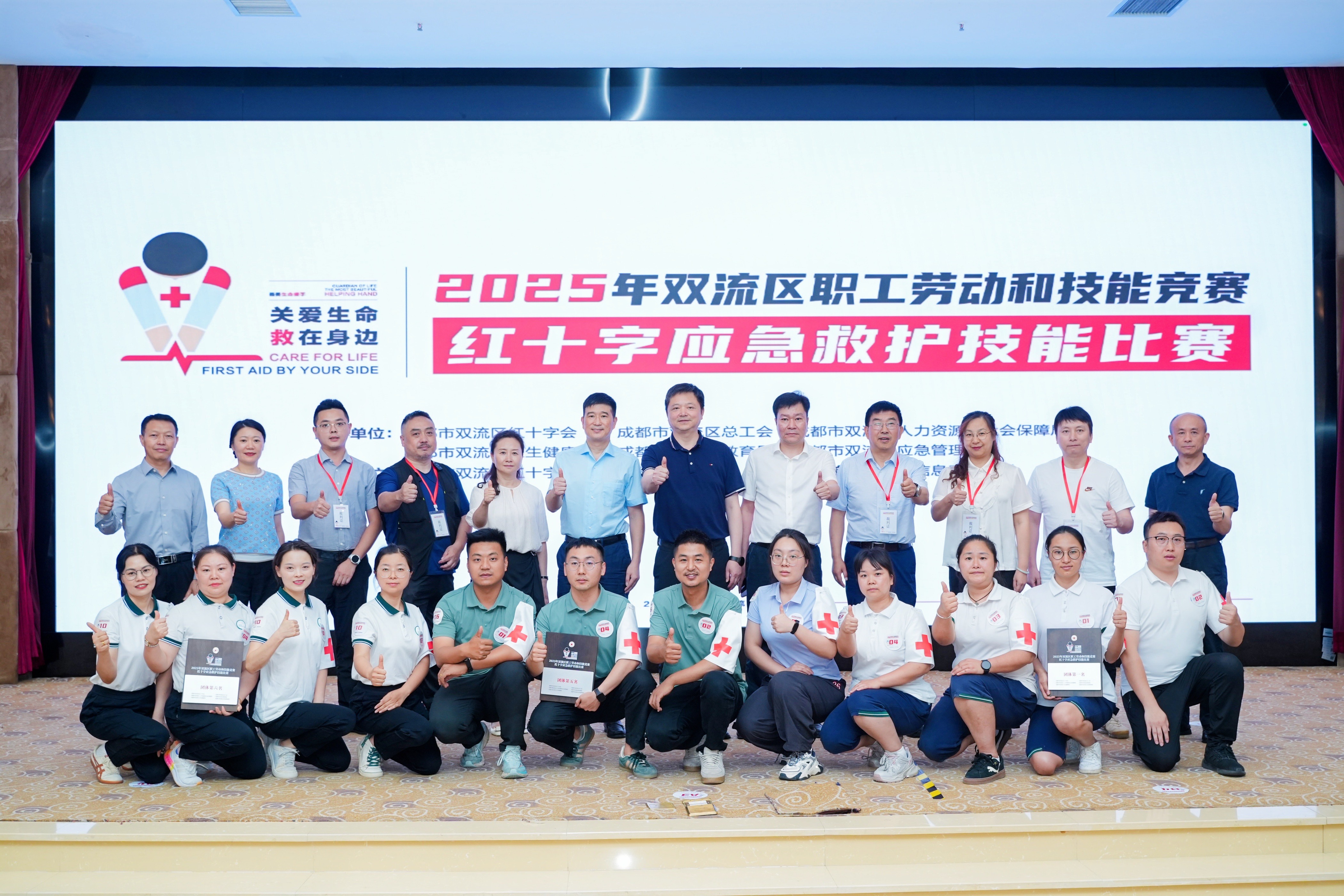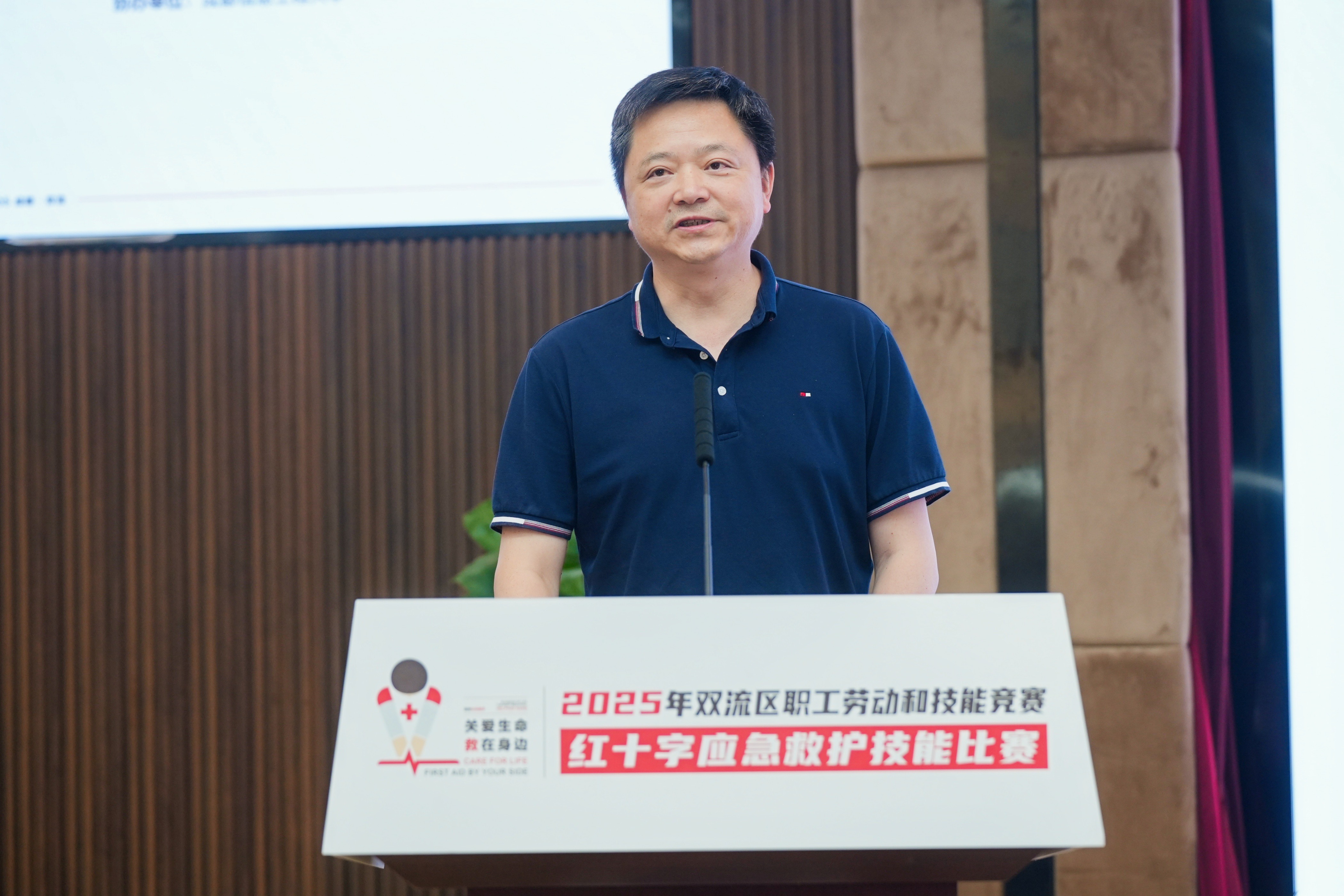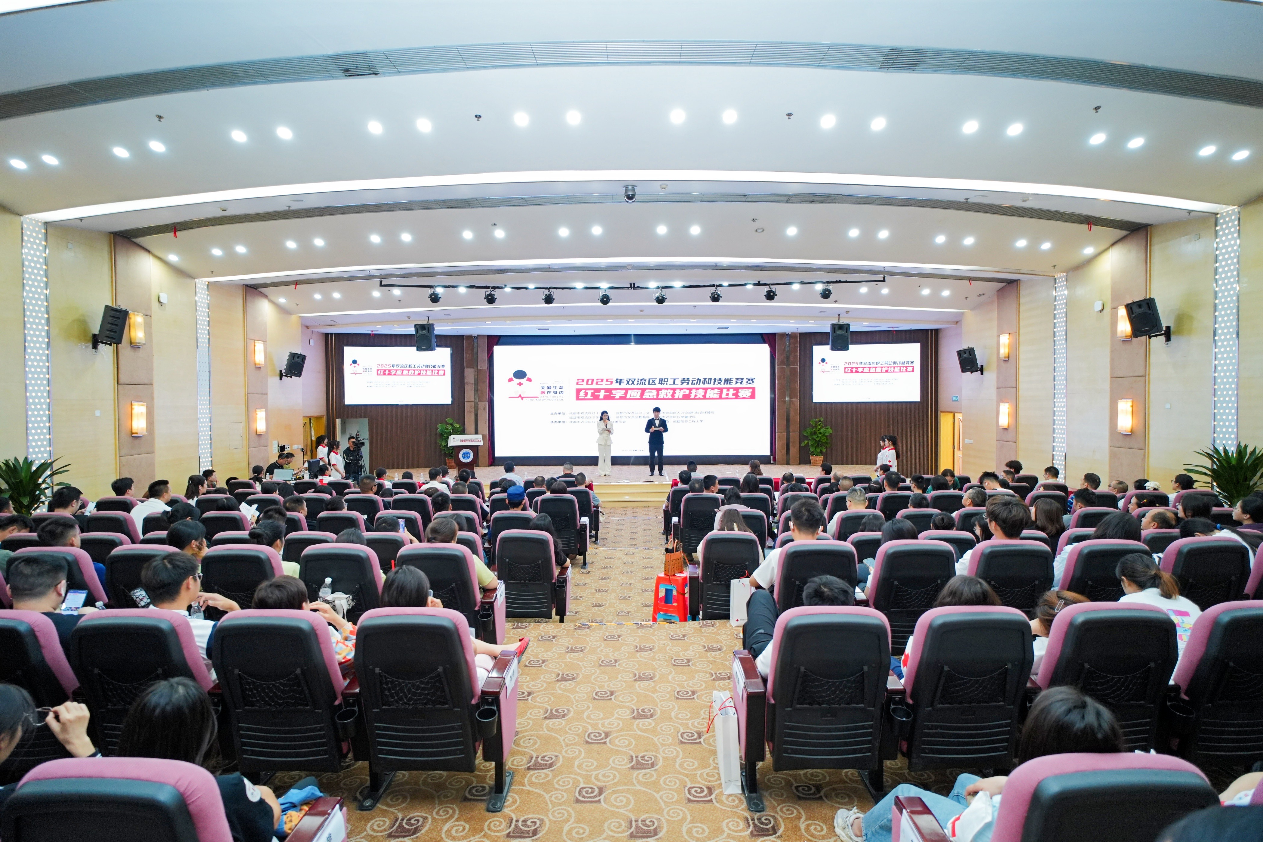 【本网讯】5月28日,由成都市双流区红十字会、成都市双流区总工会、成都市双流区人力资源和社会保障局、成都市双流区教育局、成都市双流区卫生健康局、成都市双流区应急管理局主办,伟德官网协办的“2025年双流区职工劳动和技能竞赛红十字应急救护技能比赛”在航空港校区国际会议厅举办。比赛主题为“热血双流·‘救’在身边”,共有镇(街道)、机关、学校、企事业等单位的63支队伍、252名队员参加比赛。学校党委副书记杨奇才出席开幕式。