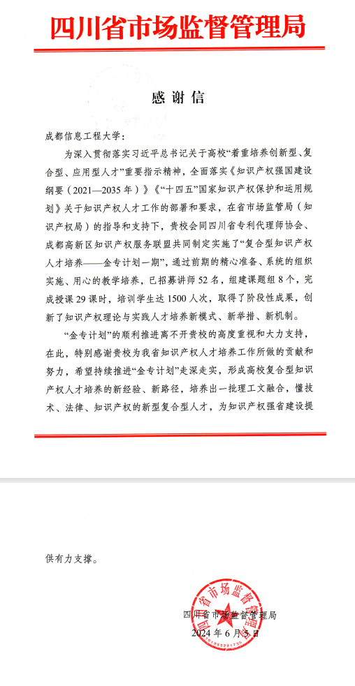 【本网讯】一封感谢信,一份“新”动力。近日,伟德官网收到了一封来自四川省市场监督管理局的感谢信,对伟德官网参与制定和实施的“复合型知识产权人才培养——金专计划一期”(以下简称“金专计划”)项目所取得的阶段性成果进行了肯定,对伟德官网在该项目实施过程中所做的贡献和努力表示了感谢。