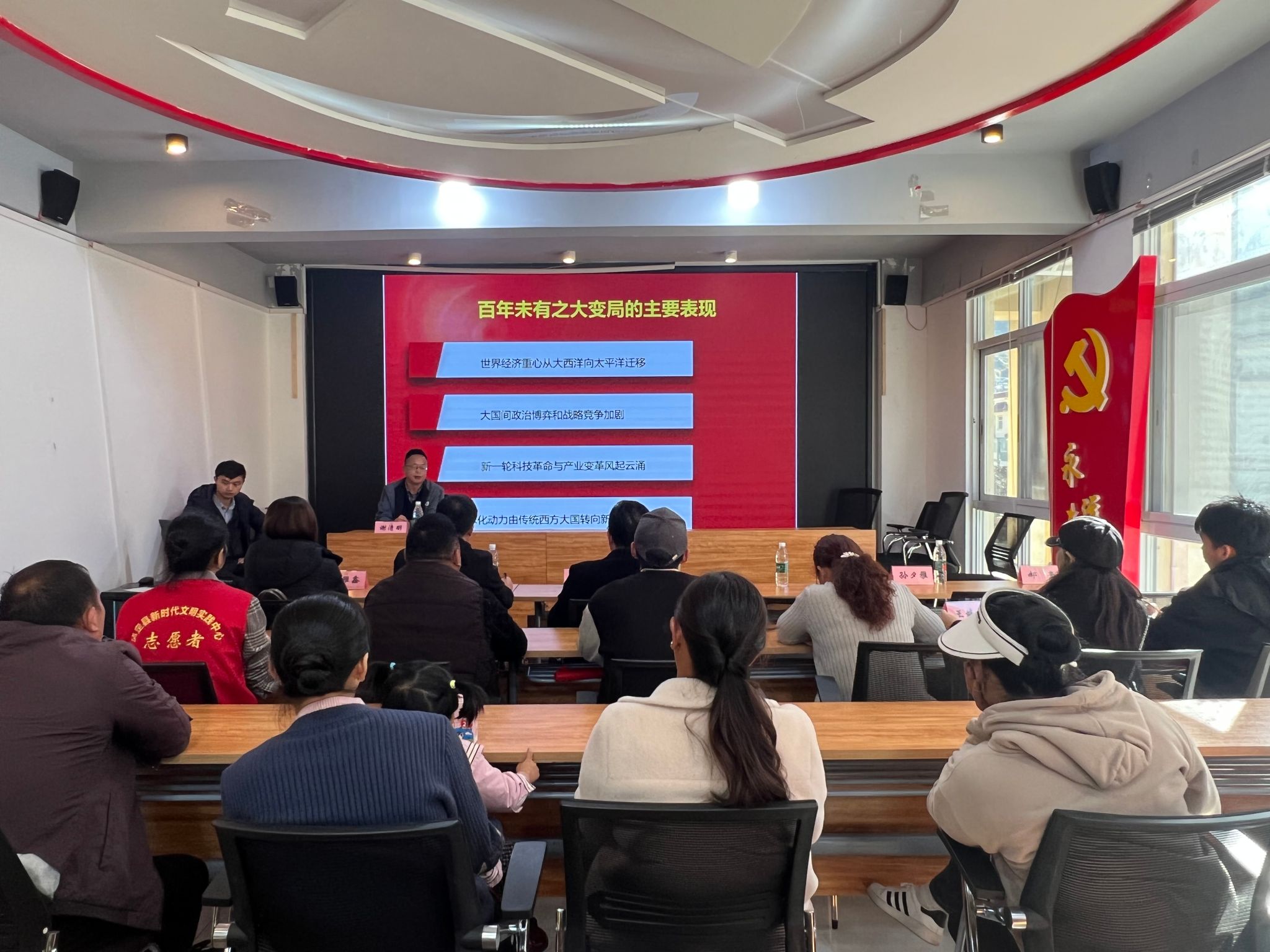 座谈调研中,马克思主义学院党委书记谢清明、文化艺术学院党委书记闵卫东等与烹坝镇负责人、沙湾村“两委”干部,就如何推进乡村党建、文化建设、依法治村、农产品营销等乡村振兴存在的问题和未来发展方向进行了深入的交流。文化艺术学院还结合学科特色就村容村貌美化和农特产品品牌设计等内容进行了专题探讨,就合作方向达成初步意向。随后,谢清明依托马克思主义学院的学科优势,以“学思想,悟精神,为建设中国式现代化奋力前行”为题,为当地干部和群众作了一堂党建专题报告,他紧紧围绕党的二十大精神,从“中国共产党百年奋斗的历史经验、百年未有之大变局的历史关口、第四次工业革命的历史机遇、全面小康实现后新的历史任务”等四个方面进行了深入阐述,“无论我们走得多远,都不能忘记来时的路。”谢清明强调,“我们从乡村走来,必然不能忘记振兴乡村,中国式现代化道路不能落下乡村,全面推进乡村振兴是实现中国式现代化的关键所在。”