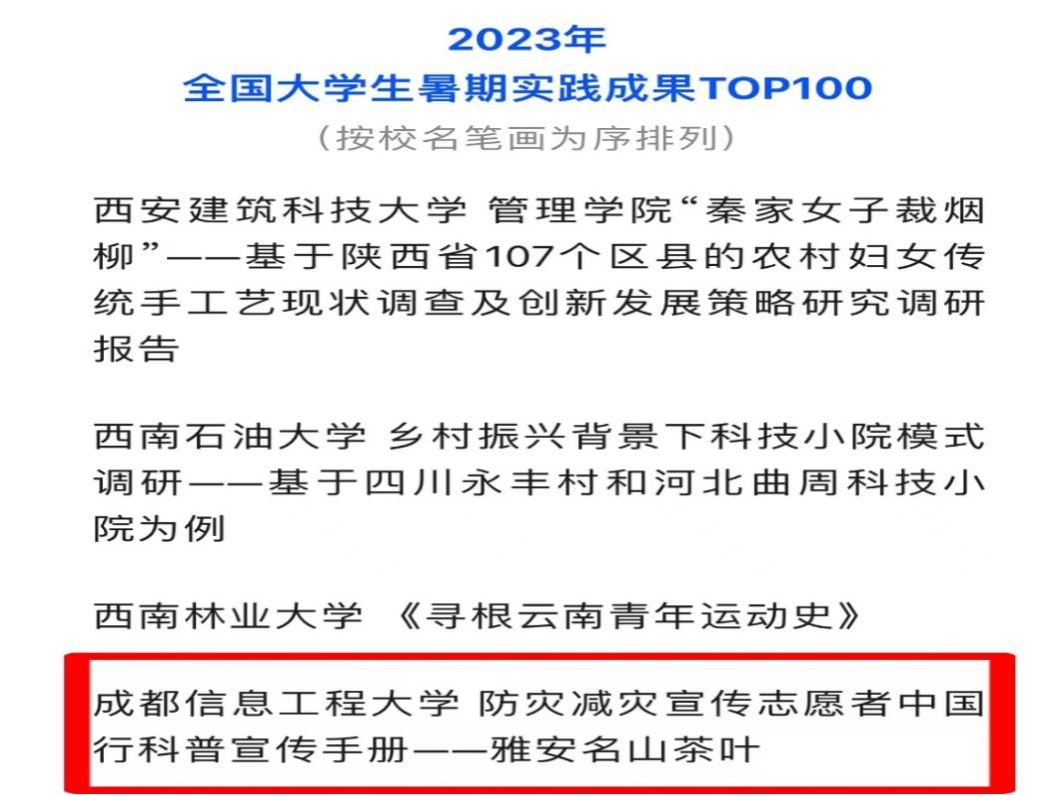 【本网讯】近日,中国青年报公布了2023年第九届全国大学生暑期实践展示活动获奖名单,bv伟德国际1946防灾减灾宣传志愿者中国行科普宣传手册——雅安名山茶叶 入选全国大学生暑期实践成果TOP100。
