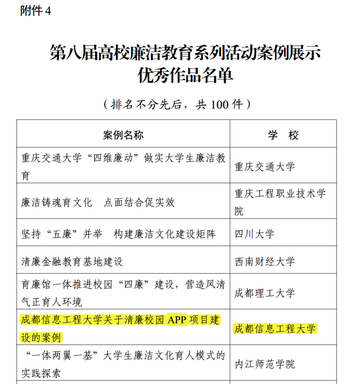 【本网讯】近日,由教育部办公厅主办的“廉洁润初心 铸魂担使命——第八届高校廉洁教育系列活动”评选结果公布,由学校纪委牵头报送的“清廉校园APP项目”被评为案例展示优秀作品,由伟德官网党委宣传部推荐报送的征文作品《倡清廉学风,扣好廉洁人生第一粒扣子》被评为校园征文优秀作品,入选项目数位列四川省内高校第三。