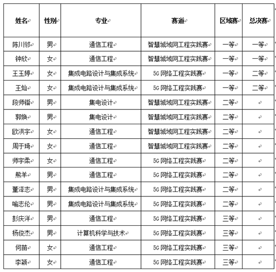 本届大赛由通信工程学院(微电子学院)负责校内培训和选拔,共吸引了通信工程、集成电路设计与集成系统、计算机科学与技术等多个专业的学生报名参赛。在2023年8月11日举行的西部赛中,伟德官网参赛团队表现不俗,斩获赛区一等奖2项、二等奖4项和三等奖2项,最终由伟德官网通信工程专业21级的陈川邻、钟欣团队和集成电路设计与集成系统专业21级的王灿、王玉婷团队代表学校参加了全国总决赛并分别获得大赛“智慧城域网工程实践赛”赛道全国一等奖和“5G网络工程实践赛”赛道全国二等奖。