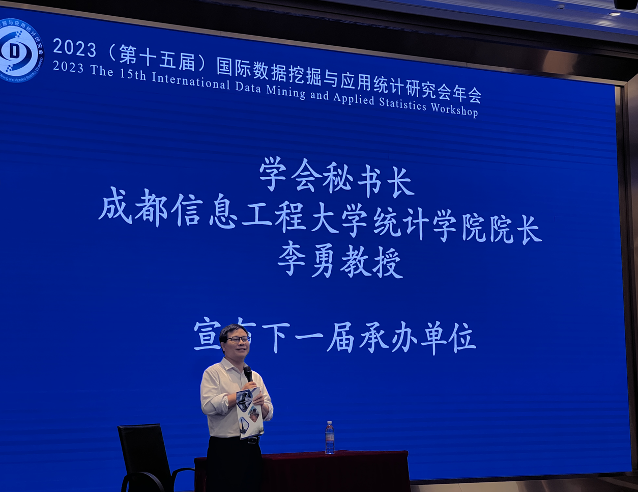 学会秘书长李勇教授作了大会总结报告,并宣布“第十六届国际数据挖掘与应用统计研究会年会”承办单位为哈尔滨商业大学。