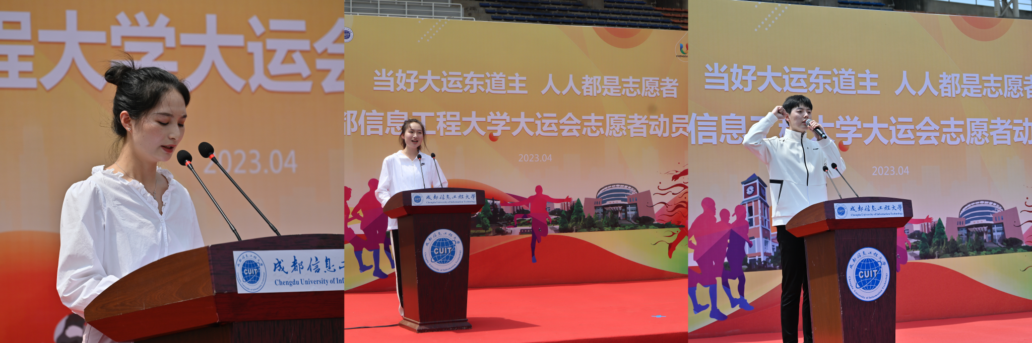 志愿者代表、文化艺术学院本科生陶悦新,带队教师代表、管理学院团委书记雷媛分别在发言中表达了做好大运会志愿服务工作的信心和决心。随后,全体志愿者庄严宣誓,尽己所能,真诚奉献,勇担使命,追求卓越,为学校争光,为成都大运会贡献青春力量。