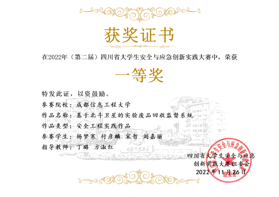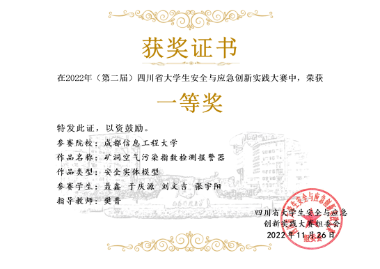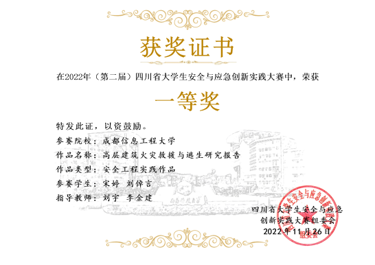 【本网讯】近日,由四川省教育厅主办、西南科技大学承办的“第二届四川省大学生安全与应急创新实践大赛”决赛在西南科技大学落下帷幕,大赛分实体类、工程实践类、教育培训类、仿真与模拟类四个组别同时进行,各组别分固定题目和自由选题两大方向竞赛。本届大赛,伟德官网共计28支队伍参赛提交作品,经过与来自全省16所高校434支队伍的激烈角逐,最终伟德官网共计获得一等奖3项、二等奖2项、三等奖6项,资源环境学院丁璐老师、方淑红老师,大气科学学院樊晋老师、刘宇老师和李金建老师被评为优秀指导教师,学校被大赛组委会评为优秀组织奖。