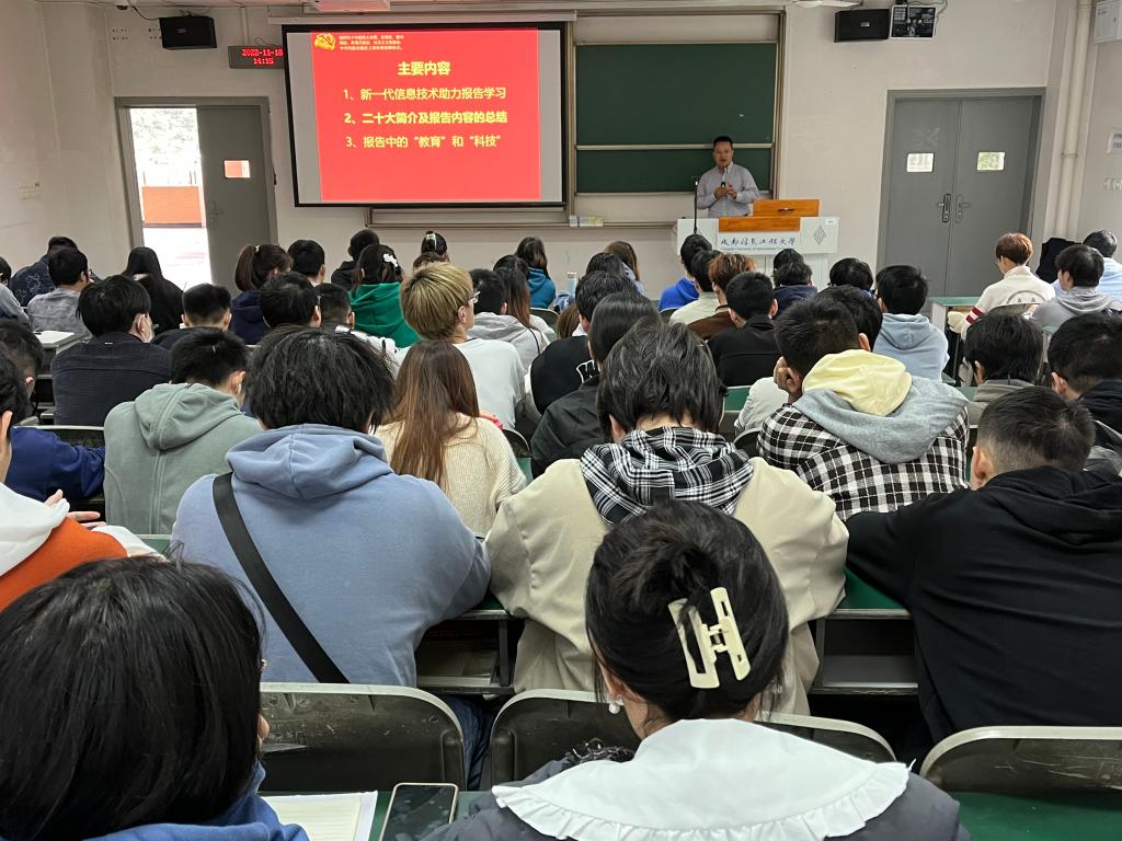 舒红平以“党的二十大报告学习与应用”为主题,内容涵盖了“关于新一代信息技术助力党的二十大报告的宣讲学习”“党的二十大精神介绍及报告主要内容的解读”,重点讲解了报告中的教育和科技两个大部分。舒红平站在专业学习的角度向同学们讲解了语言信息上现代科技的应用,结合同学们所学的专业前沿知识,引用大量的生动实例使同学们深刻理解和认识到了信息技术的发展,国家科技水平的提升,以及运用新科技的重要性及实用性;他给同学们讲解了中国共产党第二十次全国代表大会的基本情况、背景及意义,深入讲解了过去五年的工作和新时代十年的变革、开辟马克思主义新境界、中国式现代化、经济的发展及方向、教育、民主、法制、文化等内容,尤其对党的二十大报告中的“教育”和“科技”做了具体阐述,并勉励同学们加强科技文化的学习,注重前沿科技的了解,及时掌握现代化技术。