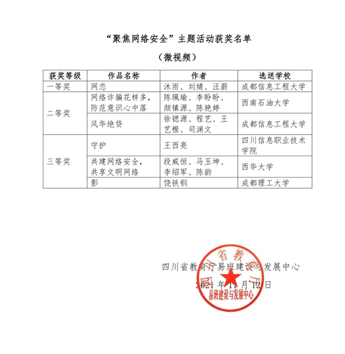 为深入宣传贯彻习近平总书记关于网络强国的重要思想,宣传贯彻习近平总书记对网络安全工作的重要指示批示精神,增强广大师生的网络安全意识,提升基本防护技能,按照四川省教育厅2021年国家网络安全宣传周相关活动安排,四川省教育厅易班建设与发展中心开展了全省易班共建高校“聚焦网络安全”主题活动。四川省教育厅易班建设与发展中心组织专家对所有参赛作品进行了认真评审,共评选出一等奖2项、二等奖4项、三等奖6项。