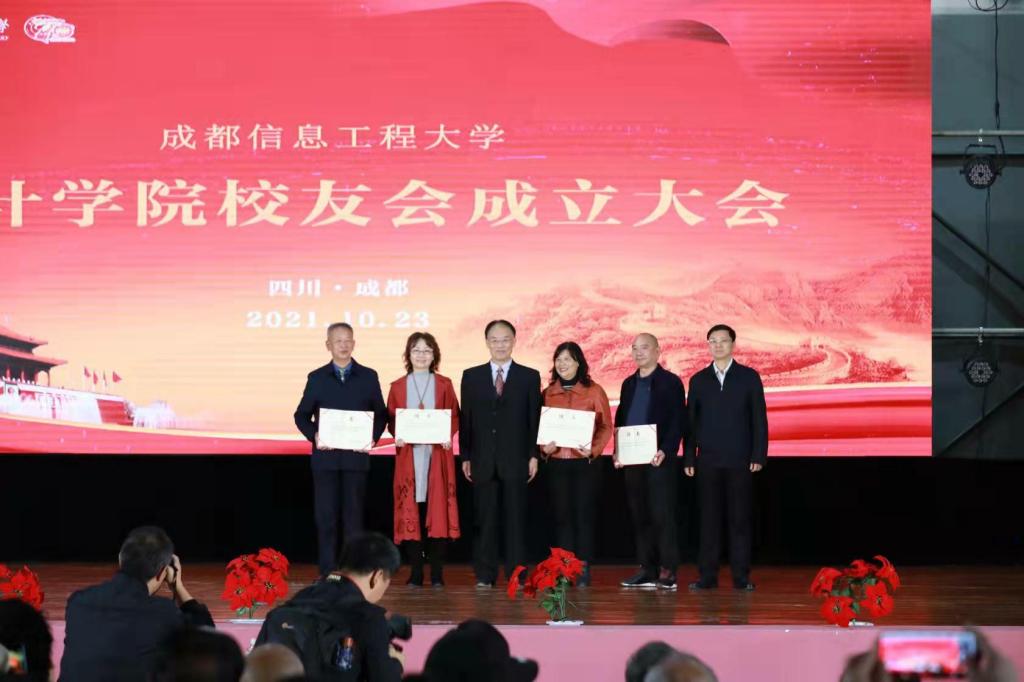 于世祥为统计学院校友会授牌并授会旗,谭平祥、钟勤建、晏正春、朱胜、金明、滕磊为统计学院校友会名誉会长、名誉副会长、会长、副会长、秘书长、副秘书长等颁发聘书。