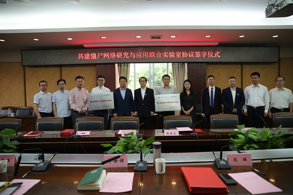 于世祥与刘长永签署了双方共建“僵尸网络研究联合实验室“协议,并共同为联合实验室授牌。陈麟为恒安嘉新(北京)科技股份公司的几名资深专家颁发了网络空间安全学院校外硕士研究生导师聘书。