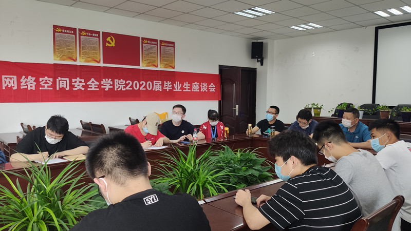 【本网讯】6月19日下午,网络空间安全学院2020届毕业生代表座谈会在双中心A402会议室举行。学院党委书记张仕斌、副书记林细俤、系主任韩斌、王娟、杨帆及毕业班辅导员张琴老师与毕业生代表们相聚一堂,回忆畅谈在网安学院四年的学习生活和成长感悟,共同探讨学院的未来发展。座谈会由林细俤主持。