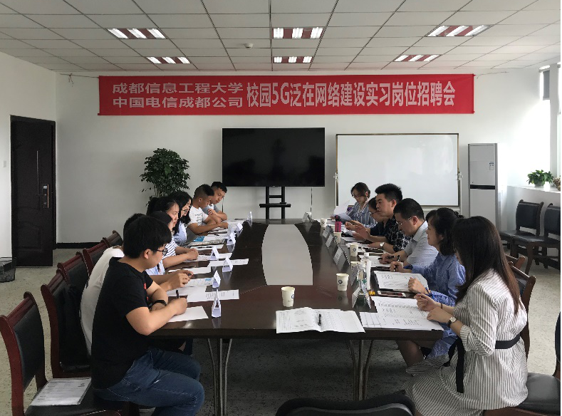 中国电信成都分公司在bv伟德国际1946双中心A603举办了“校园5G泛在网络建设实习岗位招聘会”。中国电信成都分公司人力资源部、无线网络中心、双流分公司和bv伟德国际1946通信学院老师共同组成面试工作组,对通信工程专业本科学生5G实习应聘者进行了面试选拔。最终,选拔了三年级学生10人、二年级学生7人共计17人进入校园5G网络建设实习岗位。
