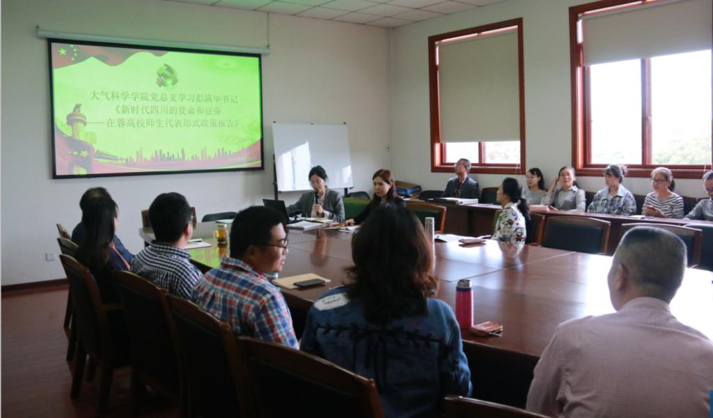 【本网讯】9月26日,大气科学学院教工党支部在气象楼310会议室召开党员大会,组织全体党员教师学习了省委书记彭清华为在蓉高校师生代表作的主题为“新时代四川的使命和任务”的形势政策报告。会议由支部书记韩琳主持。